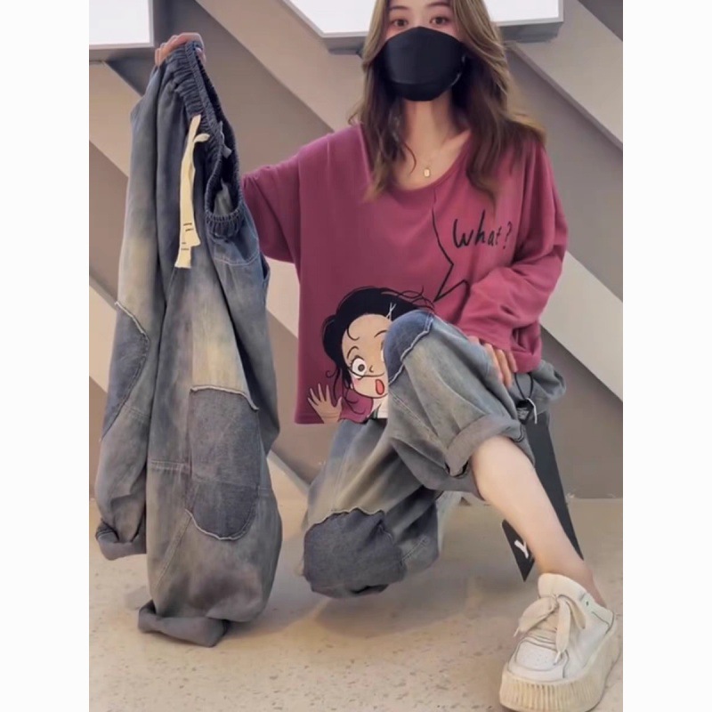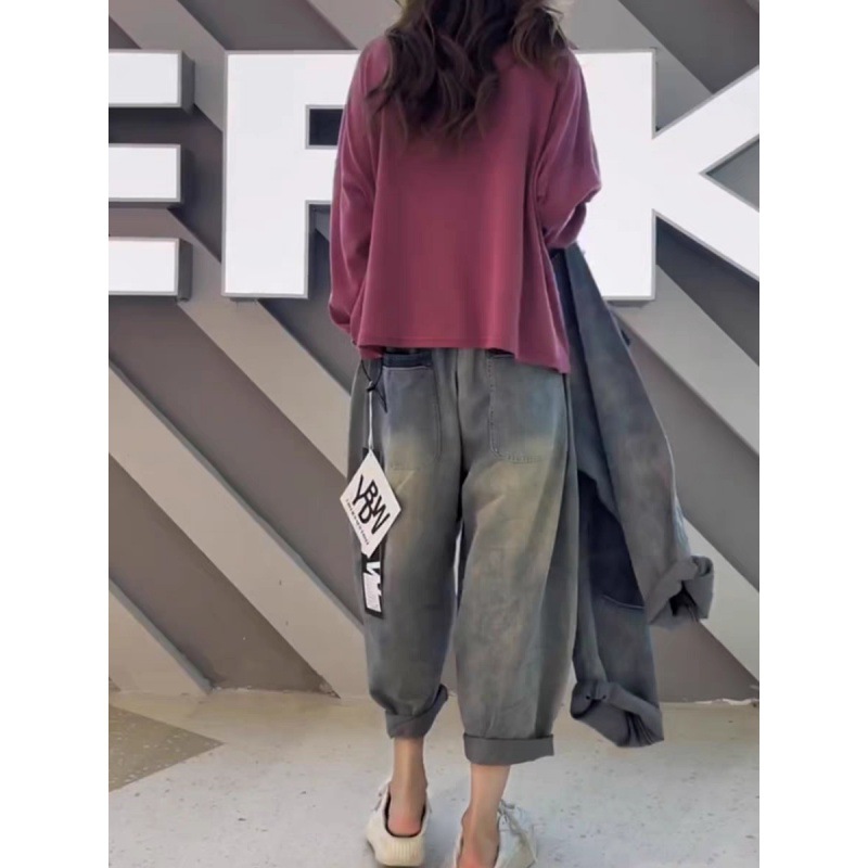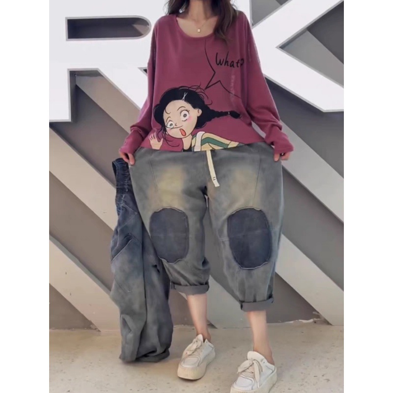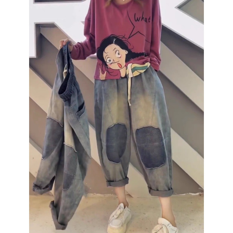 2024 summer new vintage casual jeans women’s elastic waist plus size patch loose harem pants 89
