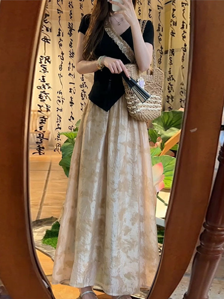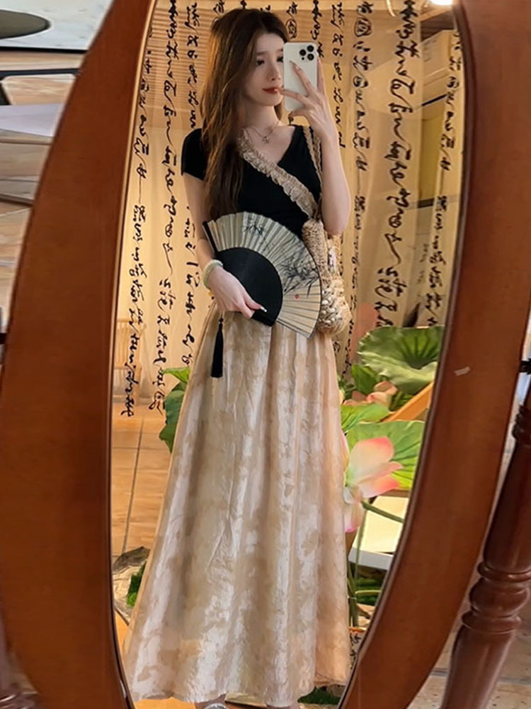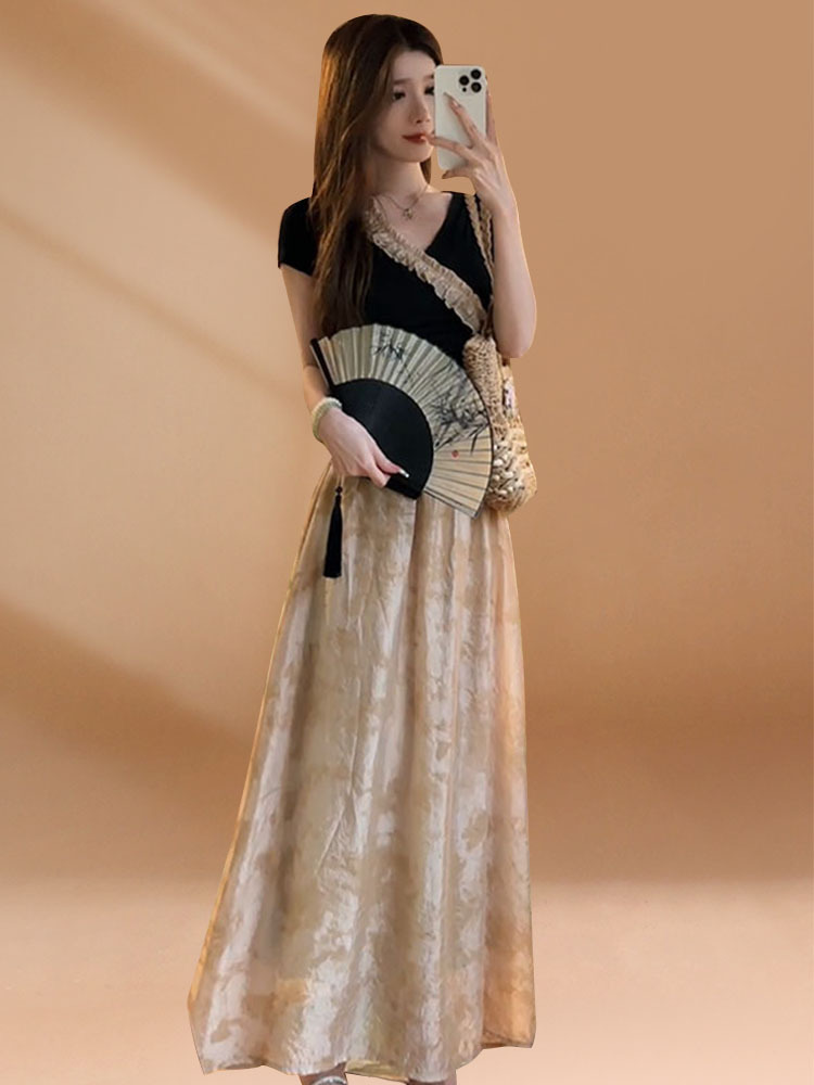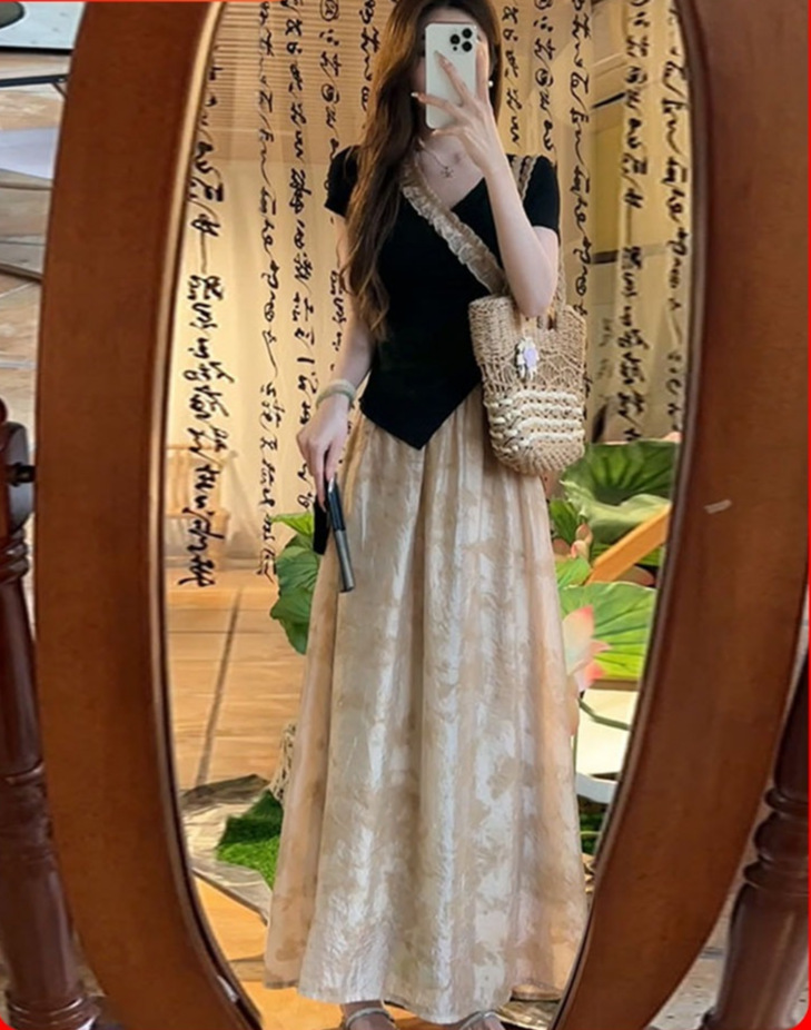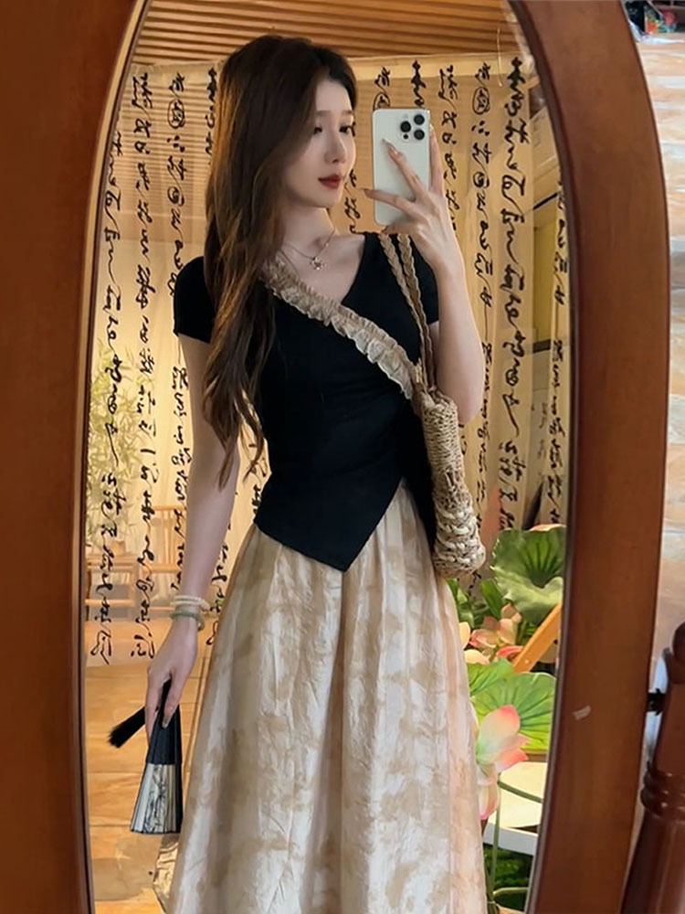 | nameOriginal | 2024 summer new women's clothing new Chinese style V-neck lace short sleeve top tie-dyed skirt two-piece set |