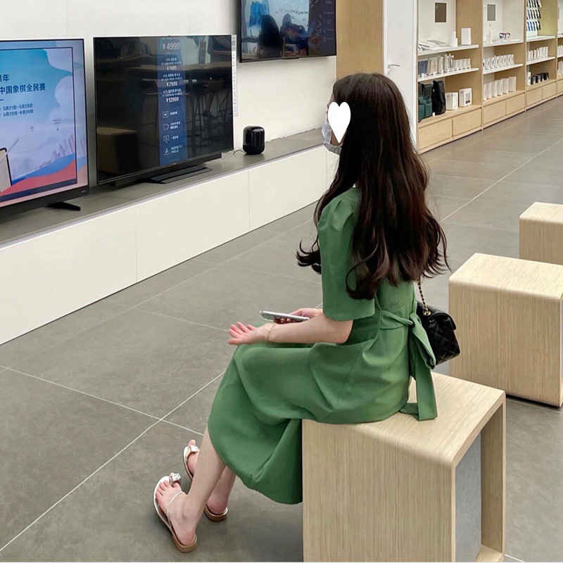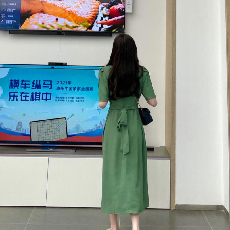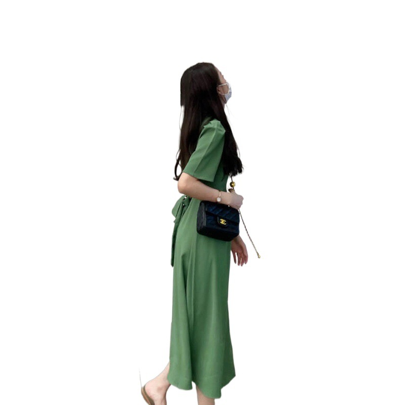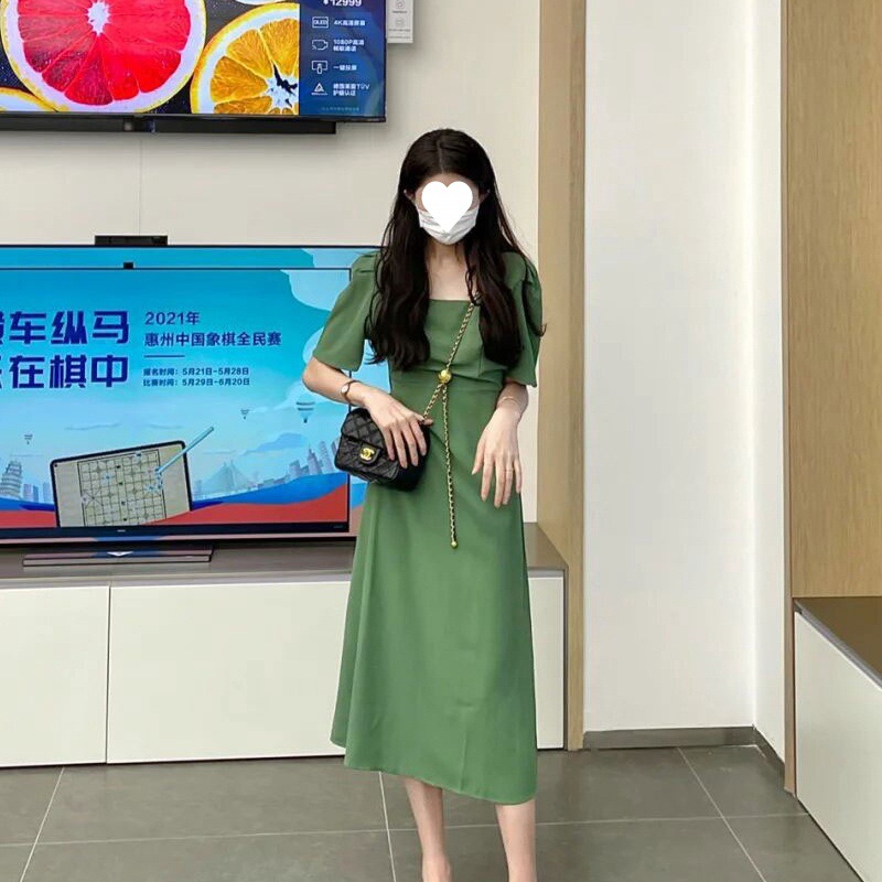 2024 Summer New Women’s Green Long Dress French Square Collar Antique Dress vintage Dress Lady Midi Dress