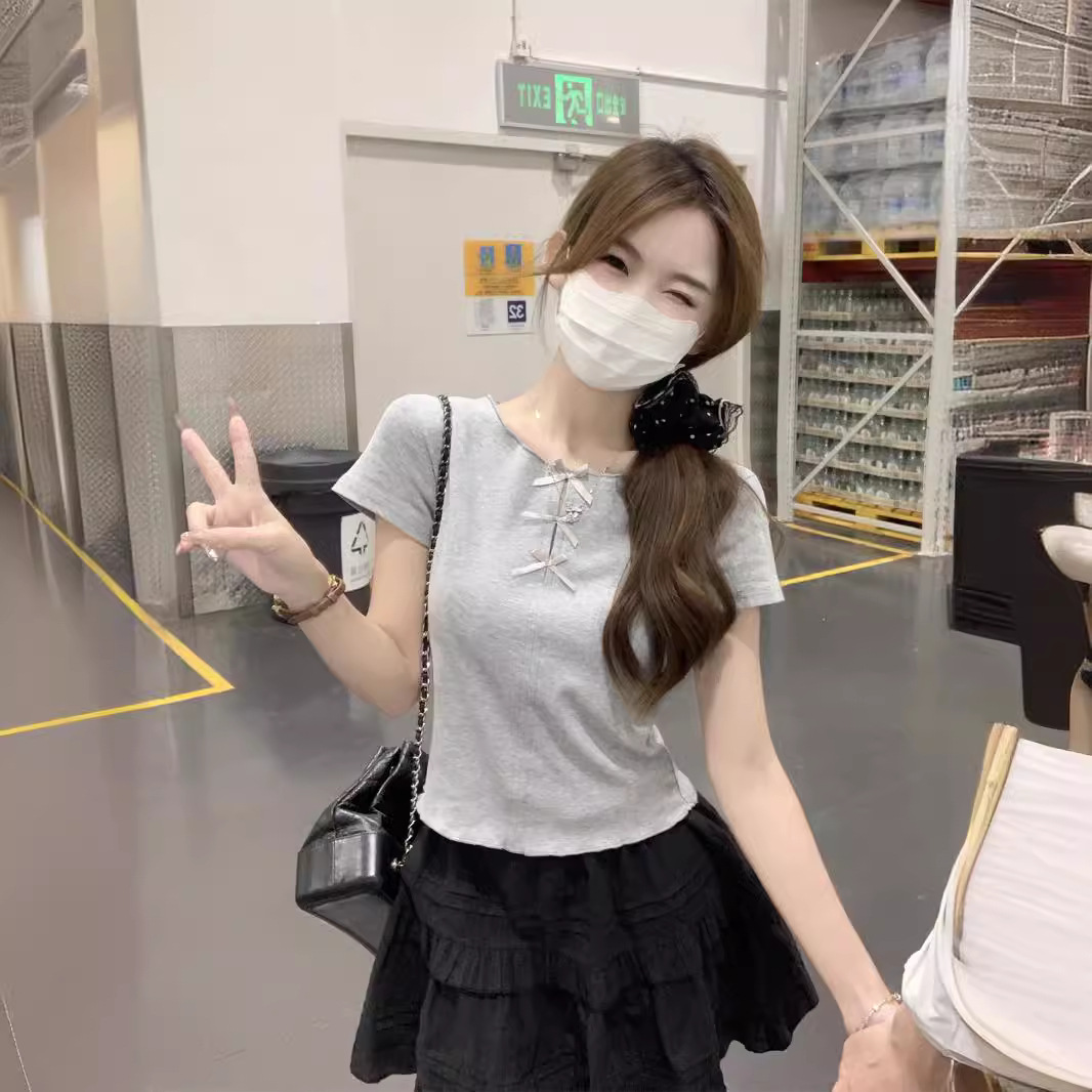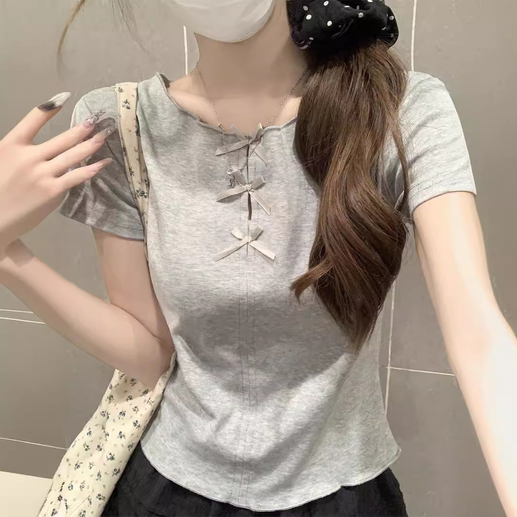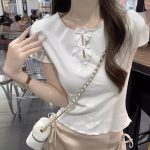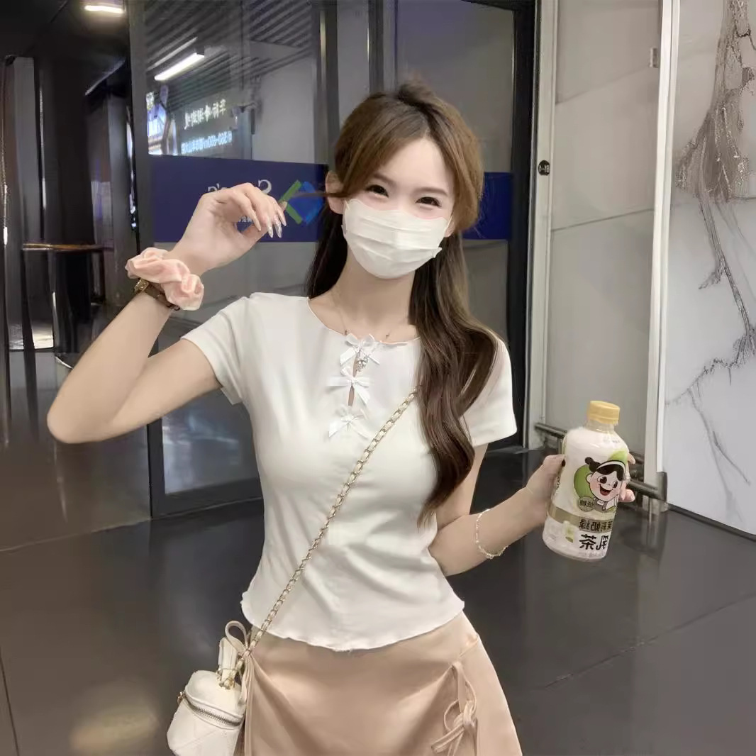 | nameOriginal | 2024 Summer New Women's Korean-style Slim-fit Hollow-out Bow with Wood-ear Edge Shoulder Short-sleeved T-shirt Top |