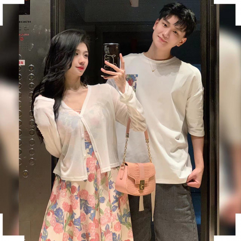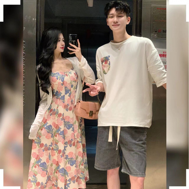 2024 Summer new women’s tea break vintage strap floral beach dress couple wear men’s T-shirt
