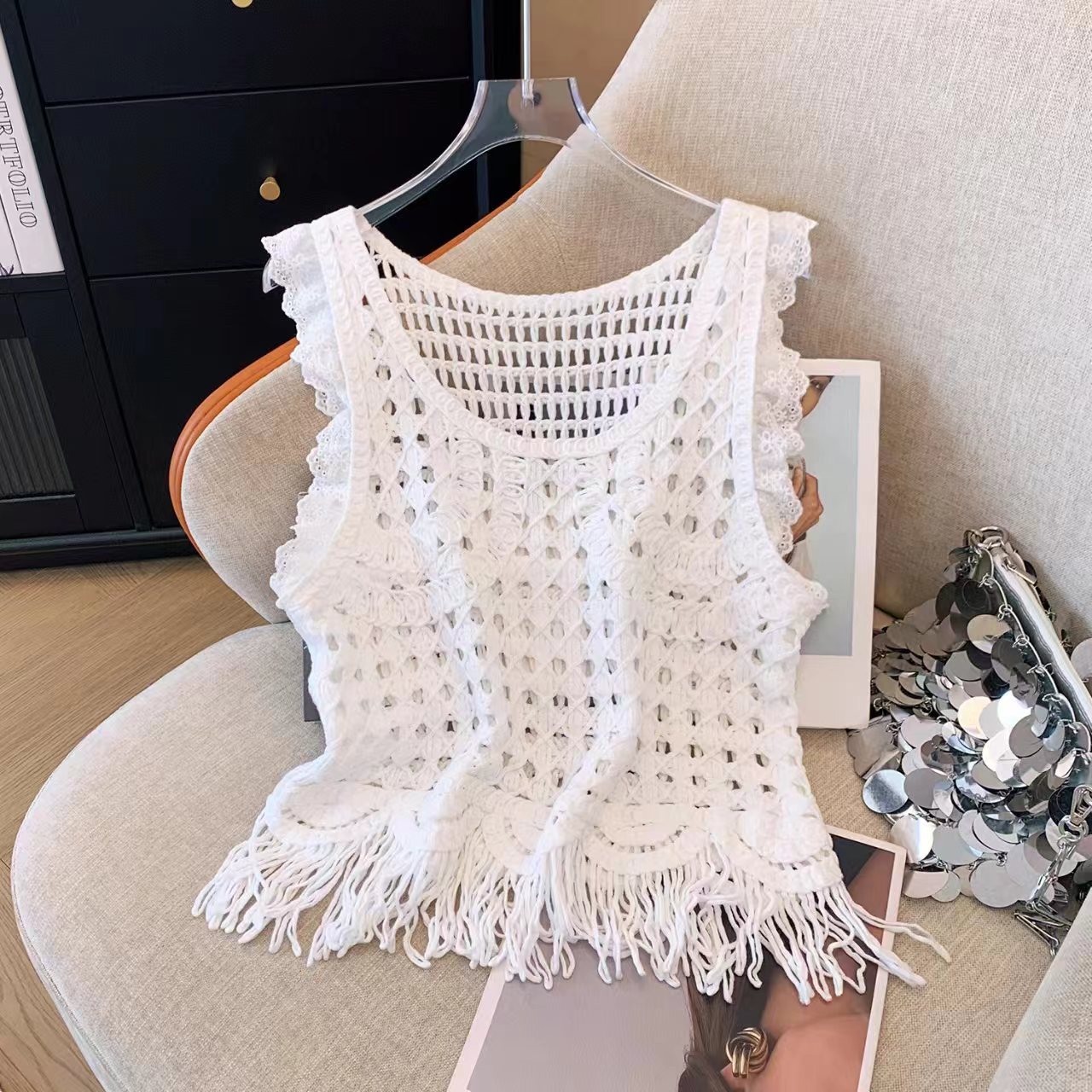 | nameOriginal | 2024 Summer Niche Design Personalized All-match Outer Wearing Knitted Hollow Short Tassel Sleeveless Vest Top |