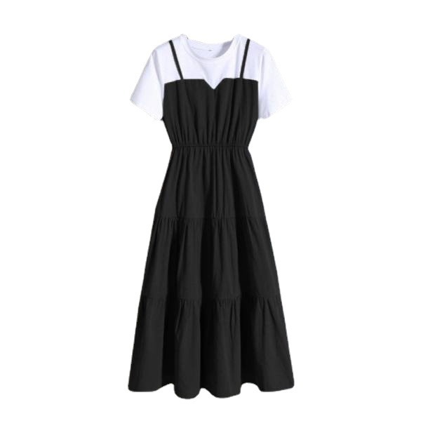 2024 Summer plus size Women's Clothing Fashion Sling Fake Two-piece Long Dress Chubby Sister Tight Waist Slimming Short-sleeved dress Women