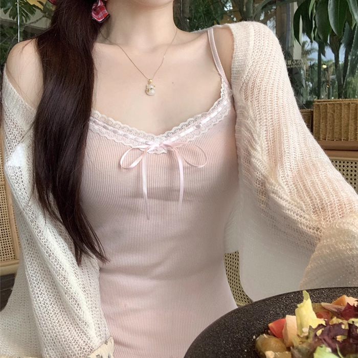 2024 Summer Pure Desire Lace Sling Small Vest Women’s Summer Sweet Spice Girl Bow Inner Base Short Top