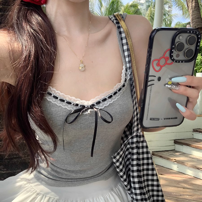 2024 Summer Pure Desire Lace Sling Small Vest Women's Summer Sweet Spice Girl Bow Inner Base Short Top