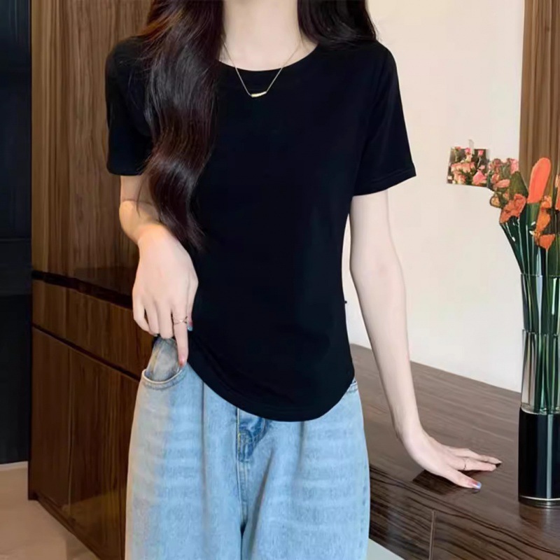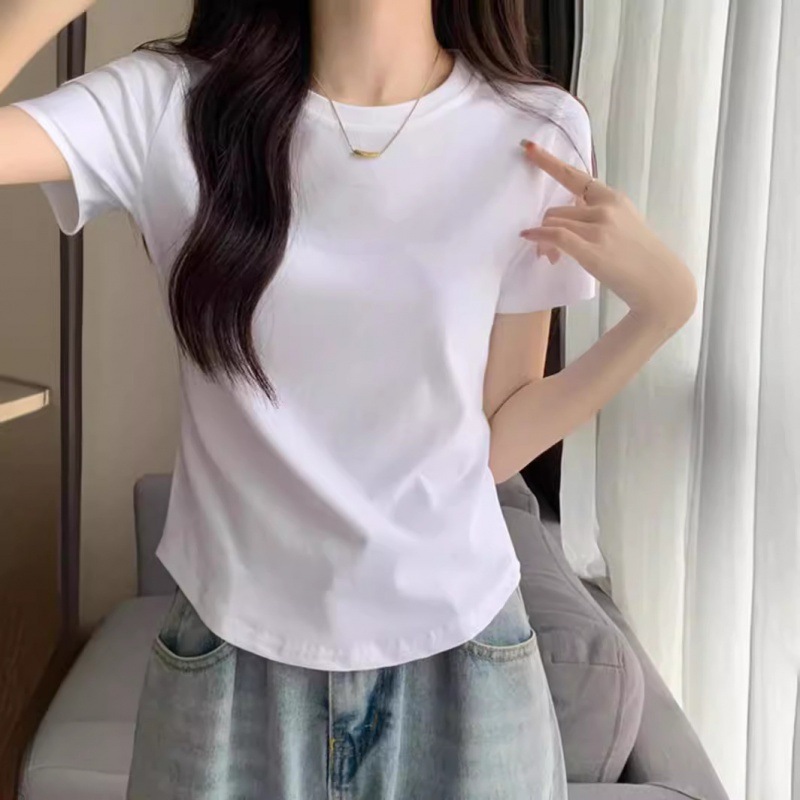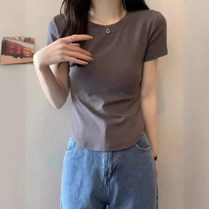 | nameOriginal | 2024 Summer Shoulder Short-sleeved Shirt Women's Solid Color Pure Desire French Top Flesh Covering Curved Hem Belly Covering |