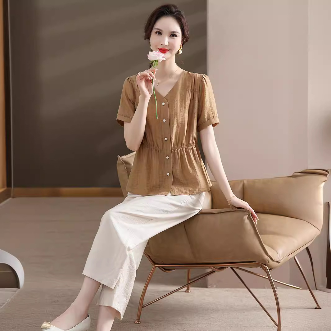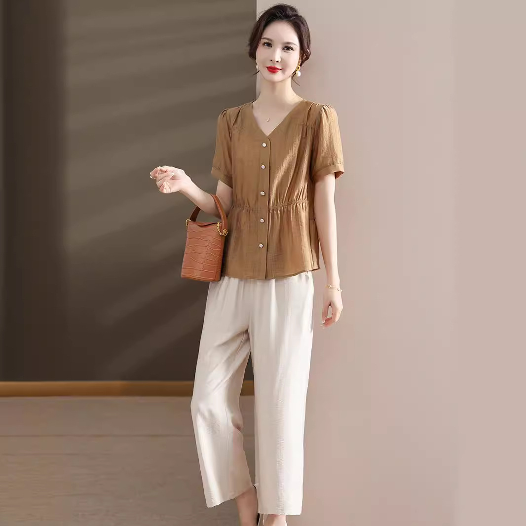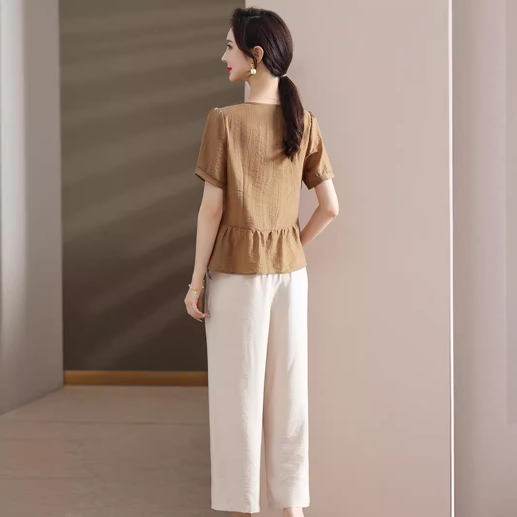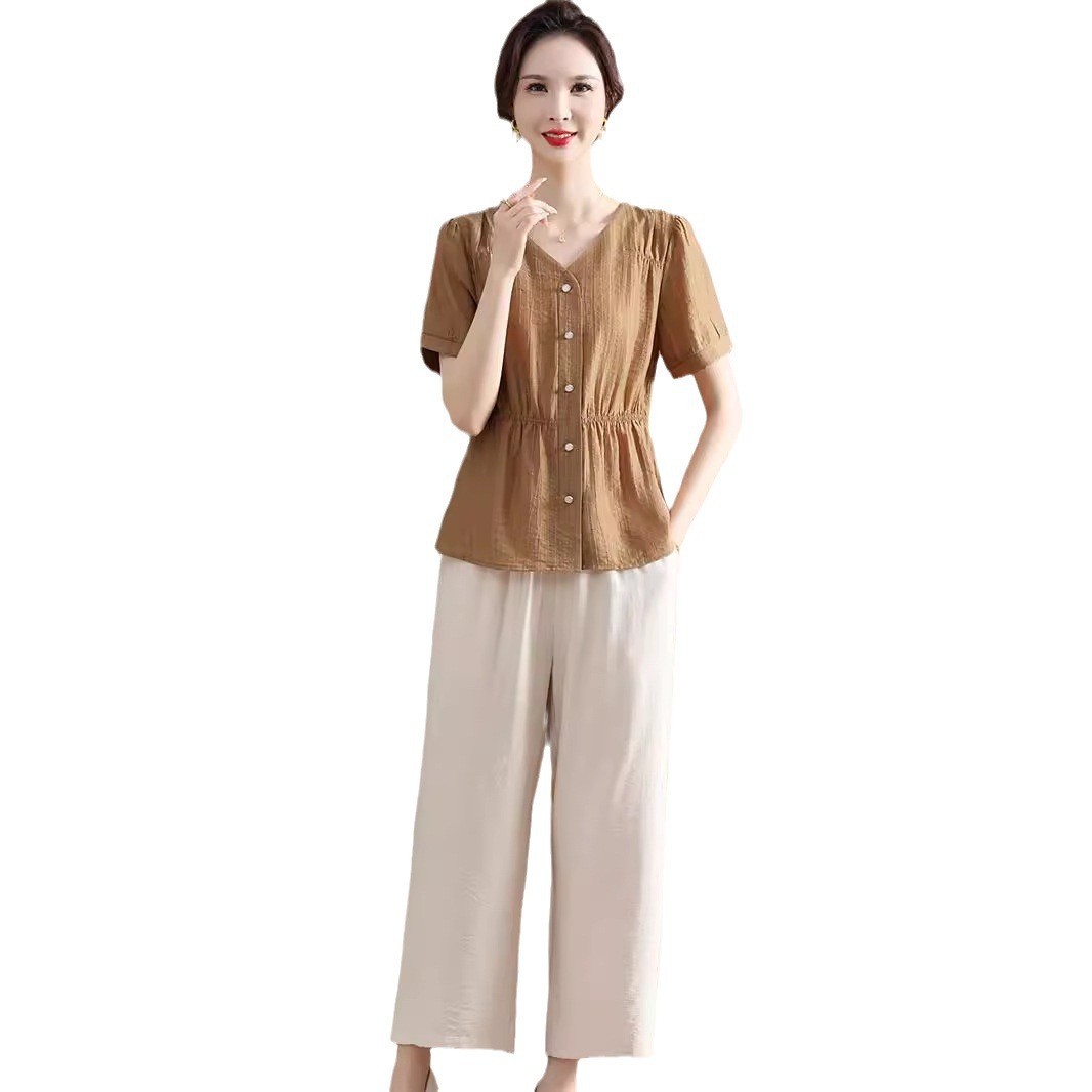 | nameOriginal | 2024 Summer Top Pants Two-piece Set Middle-aged and Elderly Women's T-shirt Solid Color Belly Covering plus size Mother suit |