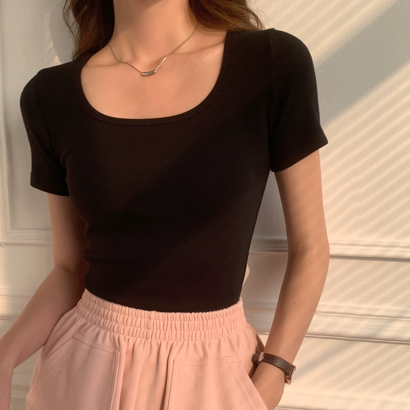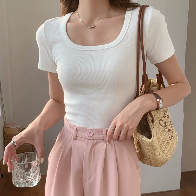 2024 Summer White T-shirt Women's Right Shoulder Top Short Sleeve French Square Neck Exposed Collarbone Cotton T-shirt with Bottoming Shirt