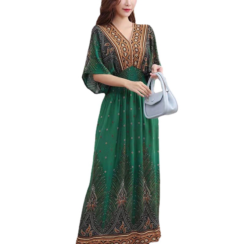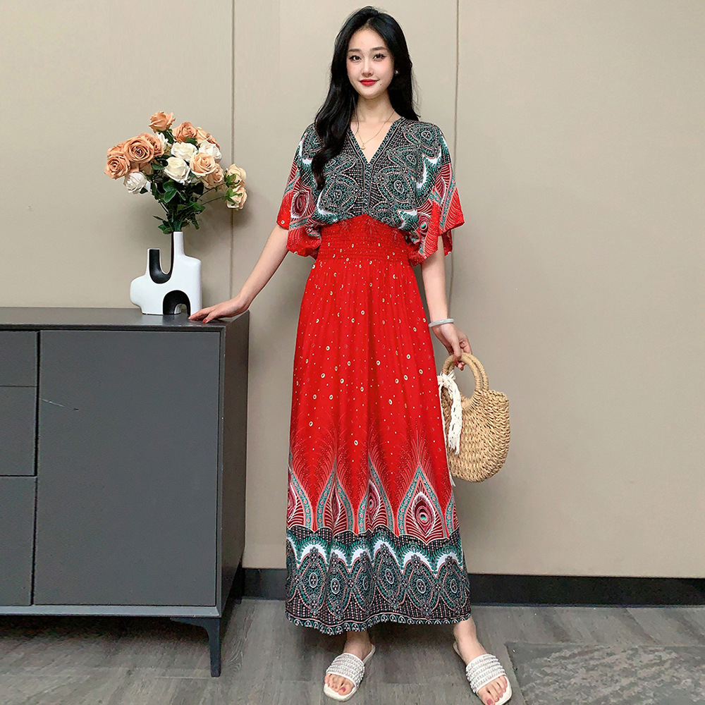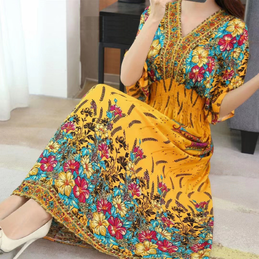 | nameOriginal | 2024 Women's Ethnic Style V-neck Cotton Silk Short-sleeved Thai Style dress Women's Summer Printed Outer Wear Vacation Style Skirt |