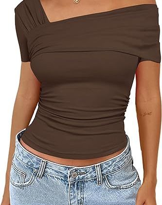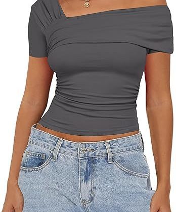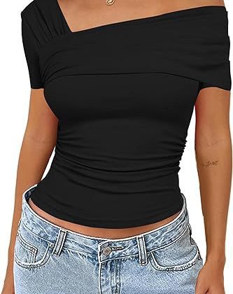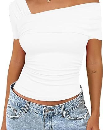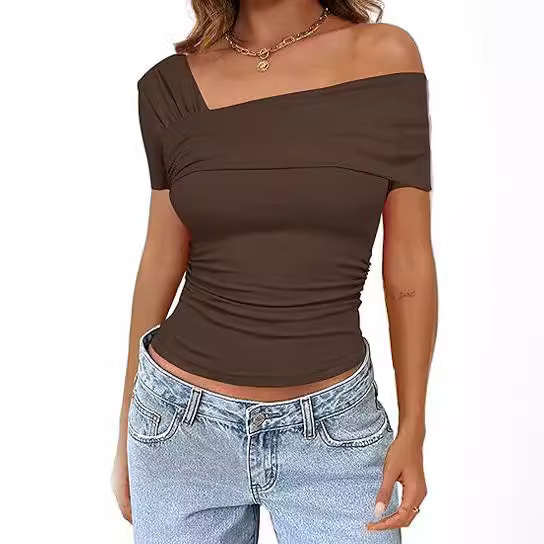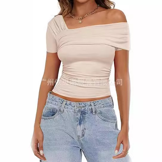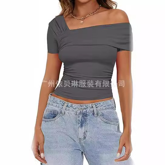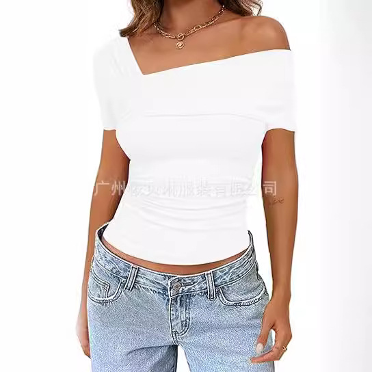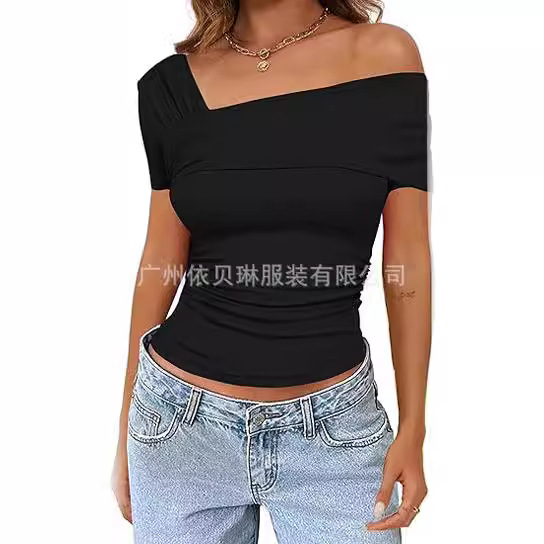 | nameOriginal | 2024 Women's One shoulder short sleeve short top frill side slim solid color outing short T-shirt |