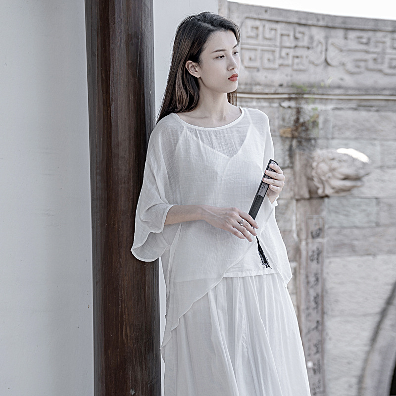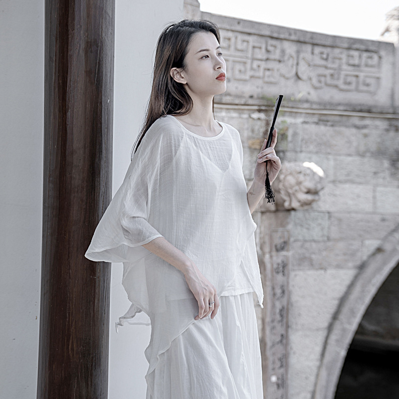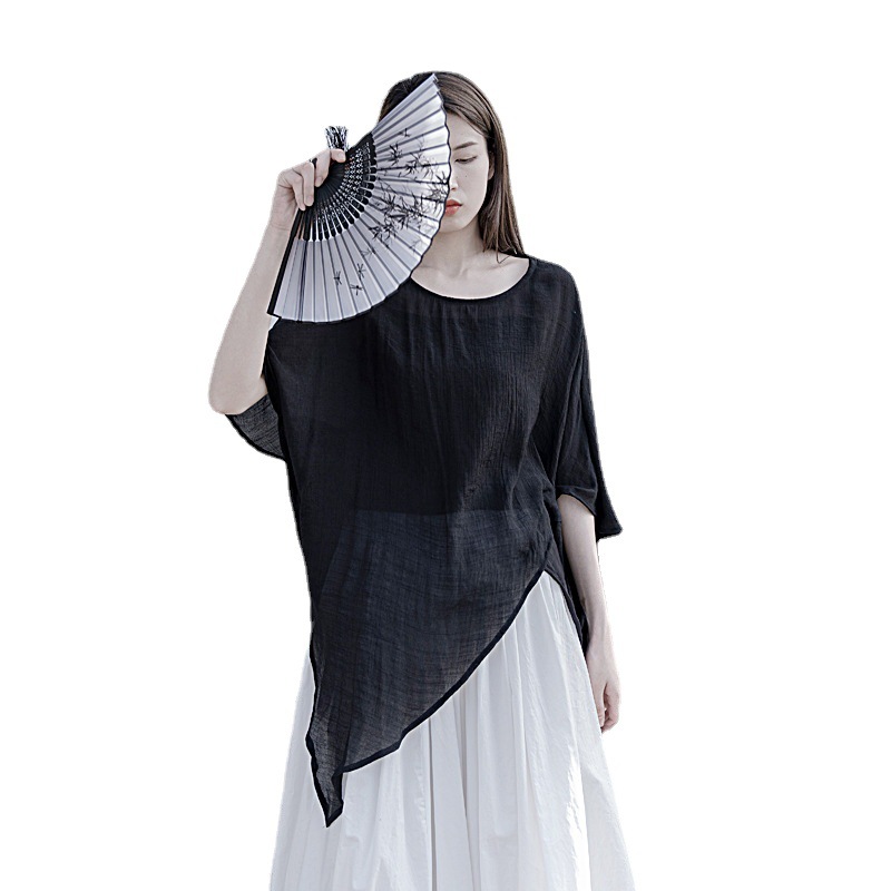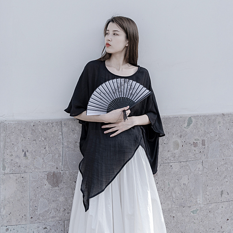 | nameOriginal | 21 Summer Small Warm Homemade Summer Black and White Blouse Irregular Split Loose Tencel Sunscreen Blouse 2 Colors |