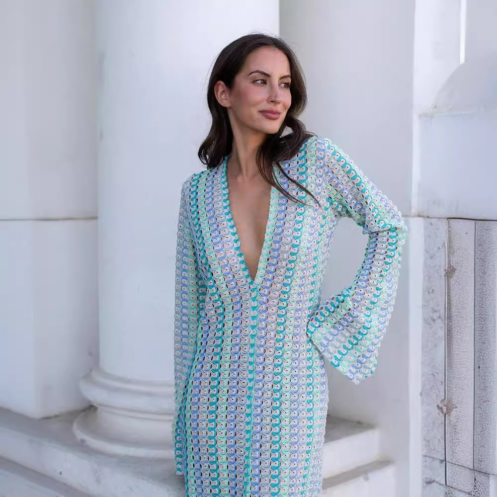 | nameOriginal | 23 Amazon AliExpress popular contrast color lace Hollow Beach V-neck low-cut front slit dress HY065 |