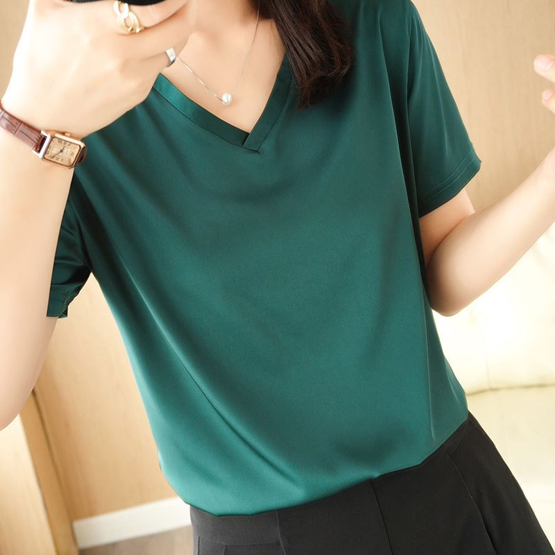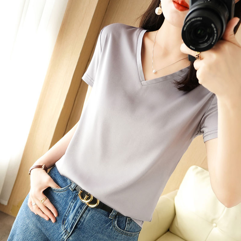 | nameOriginal | 23 Summer Silk Satin Short-sleeved T-shirt Women's Loose V-neck Acetic Acid Suit with Mulberry Silk Elegant Top T-shirt |