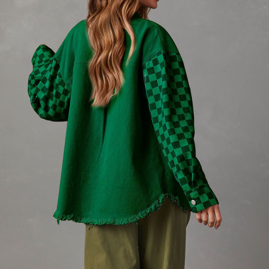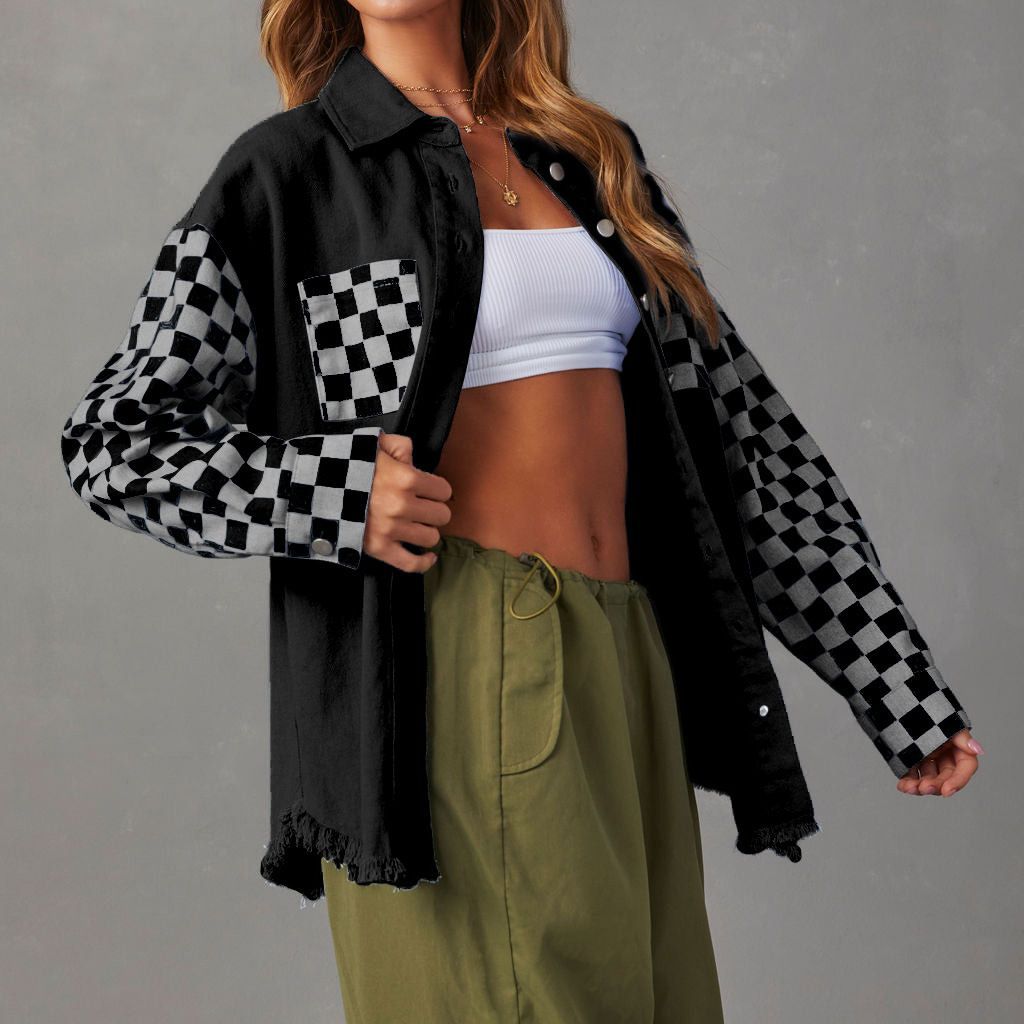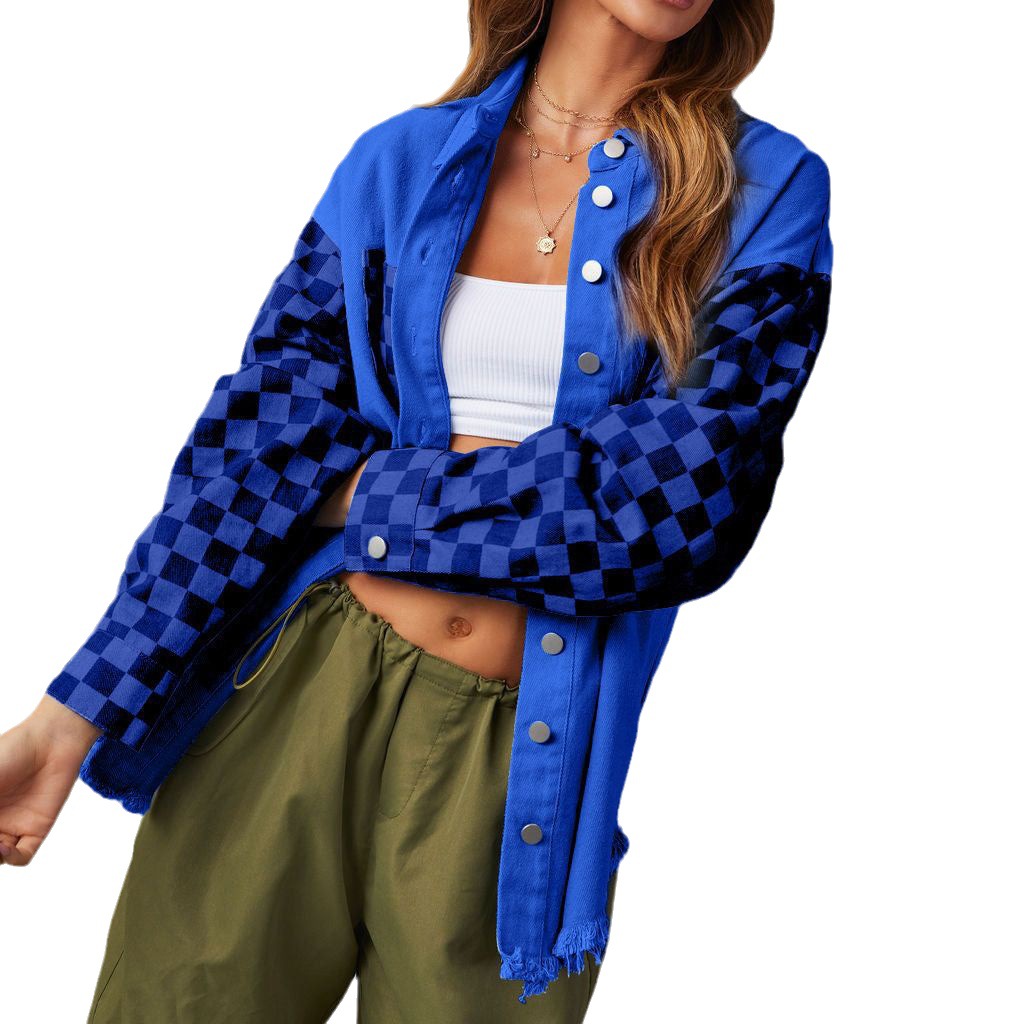 23 years of Europe and the United States cross-border autumn new fashion casual loose check contrast color rough edge denim coat women's 32132