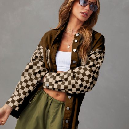 23 years of Europe and the United States cross-border autumn new fashion casual loose check contrast color rough edge denim coat women’s 32132
