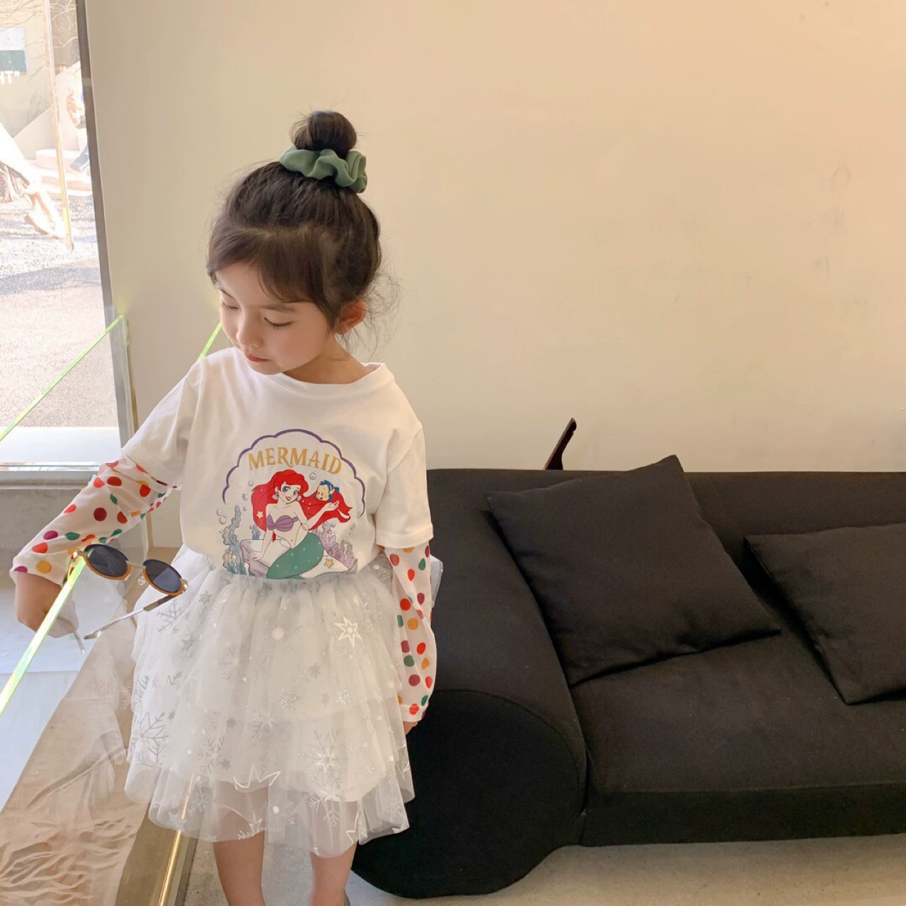 25 girls T-shirt Spring and summer new princess breathable ice sleeve splicing pure cotton fake two-piece sunscreen base shirt t mermaid