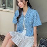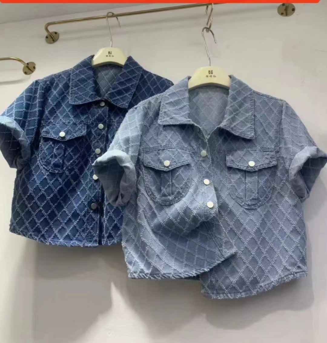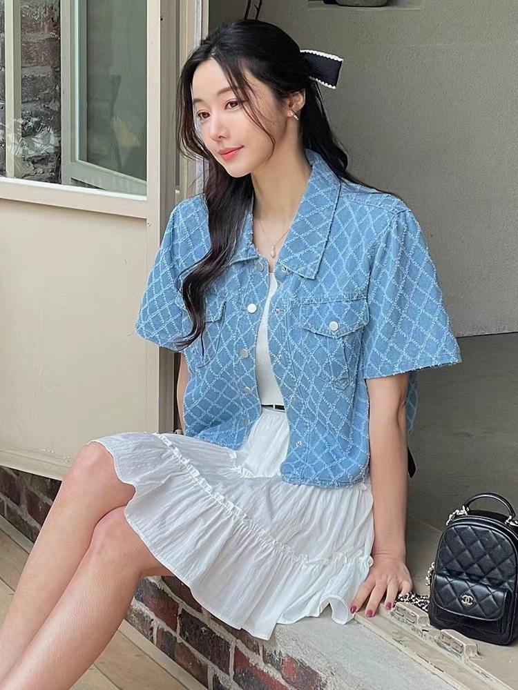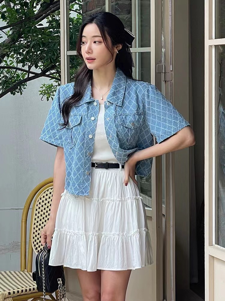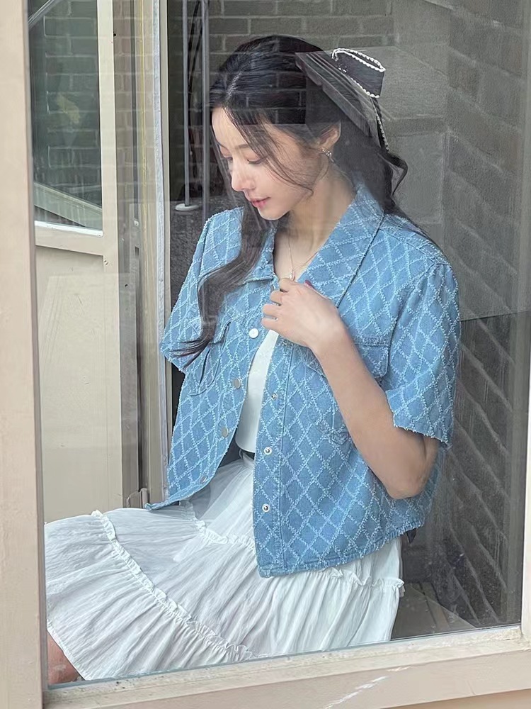 24 Summer New All-match Fashion South Korea Chic Diamond Plaid Denim Short-sleeved Jacket