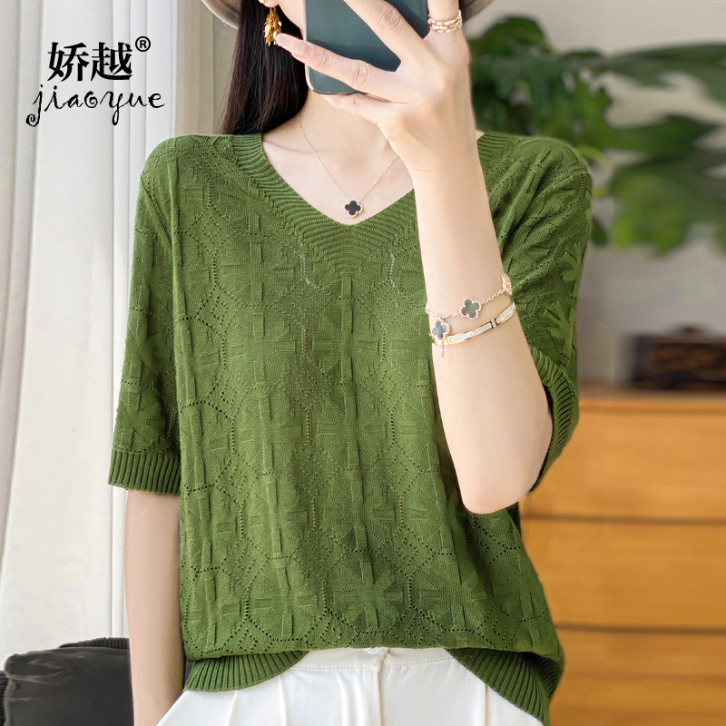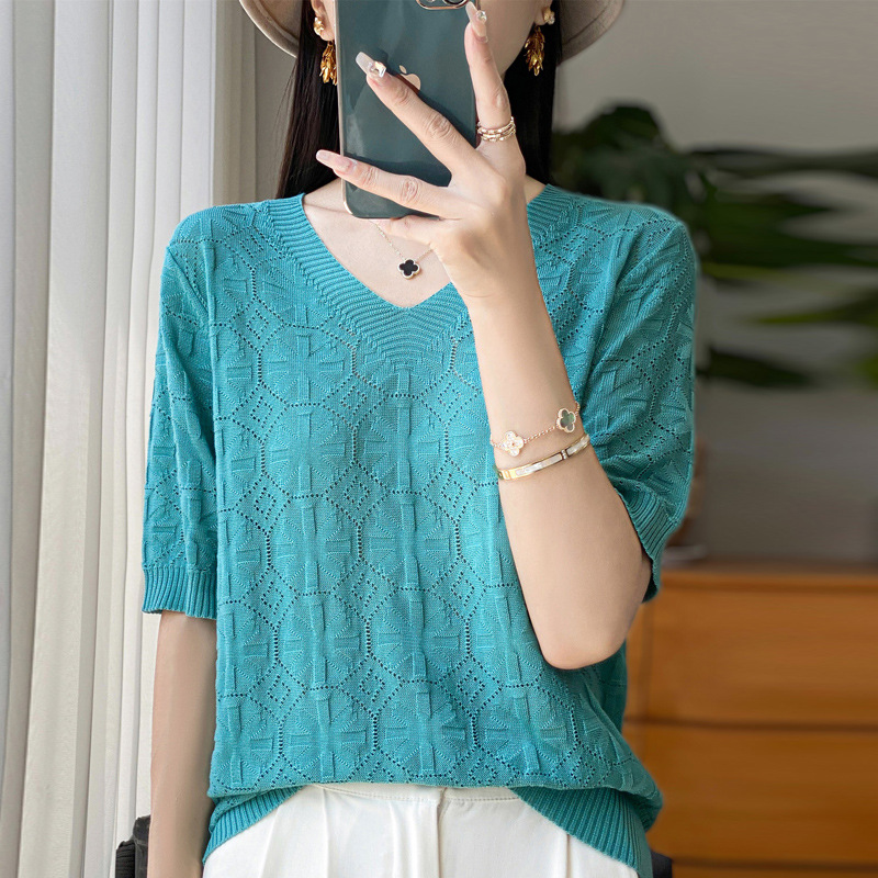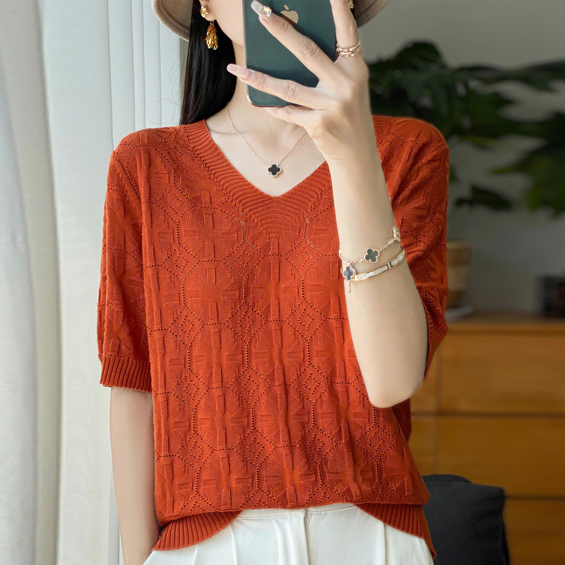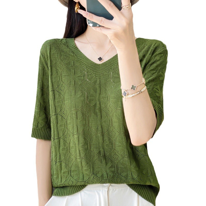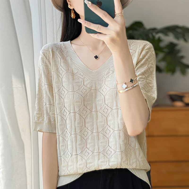 | nameOriginal | 24 Summer New Tencel V-neck Circle Hollow Thin Knitted T-shirt Korean Solid Color Ice Silk Half Sleeve Loose Top |