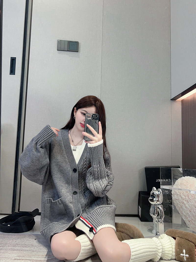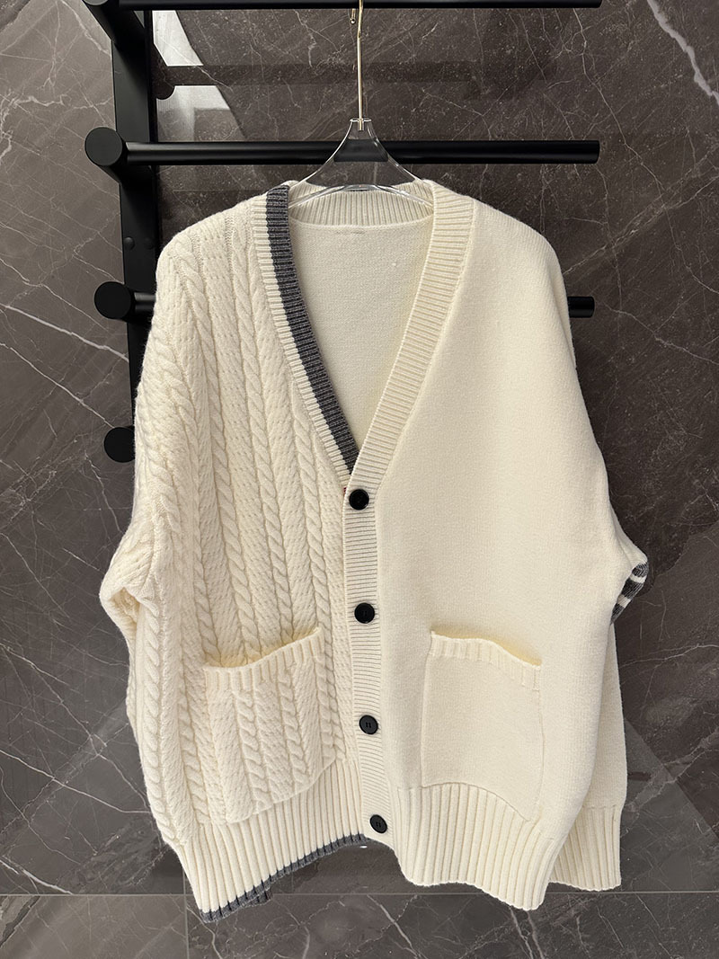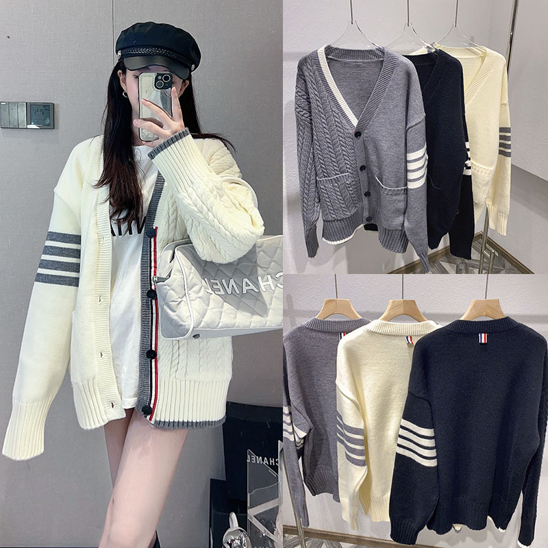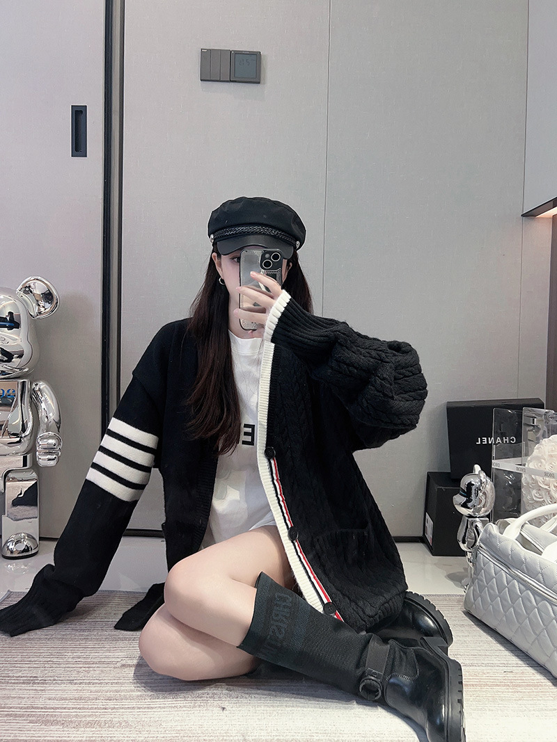 24 winter contrast color casual four bars tb knitted cardigan loose college style sweater v-neck niche high-grade coat