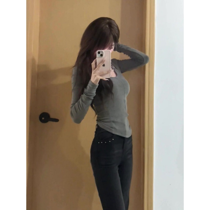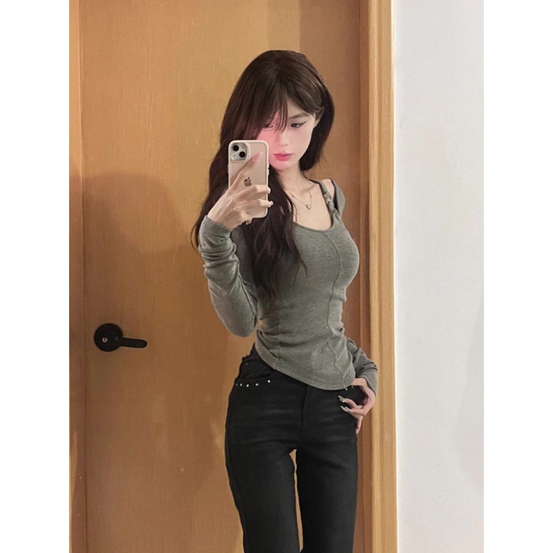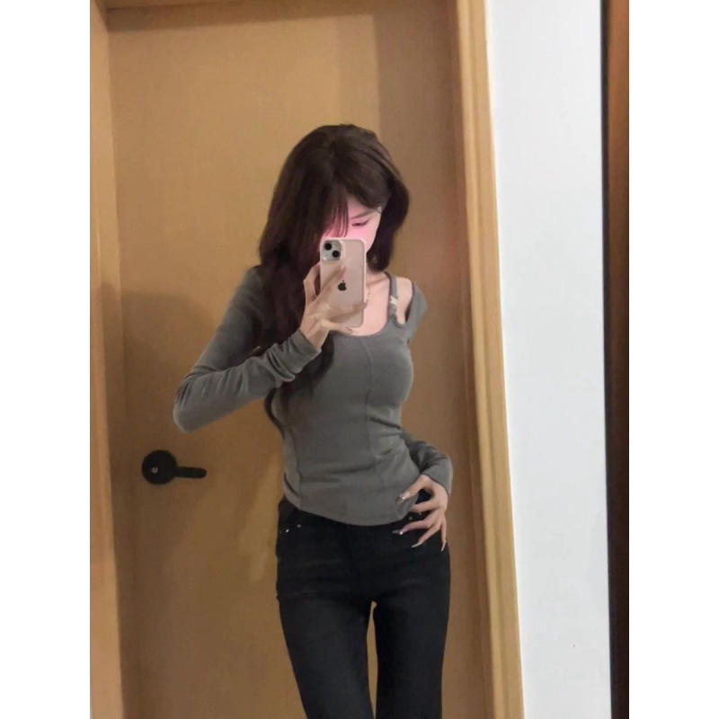 [240g thread velvet] u-collar shoulder-exposed long sleeve inner t-shirt female design sense niche slim base
