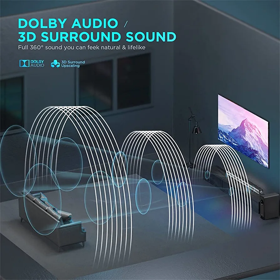 Experience a whole new level of audio with our Dolby decoding technology and Upscale 3D audio soundbar and subwoofer. Enjoy a multi-dimensional soundstage and immersive 360° surround sound that will transport you to another world. Crystal clear audio and powerful bass will make you feel like you’re part of the action. Our soundbar features four 2.25 inch medium speakers with up to 240W power and low distortion of <0.5% for the most realistic sound possible. True drivers for the left and right channels produce a soundstage 40% wider than conventional soundbars and reproduce a wide soundstage the size of a cinema screen. Our Dolby soundbar adopts a 5.0 chipset to ensure the fastest transmission speeds and stable connectivity that lower input lag to 30ms, without hissing noise or delay. The metal cabinet material and sleek design make it a stylish addition to any home entertainment system. The package includes one soundbar, and if you have any questions about the product, please contact us, and we will respond within 24 hours. Please note that there may be slight size differences due to manual measurements.