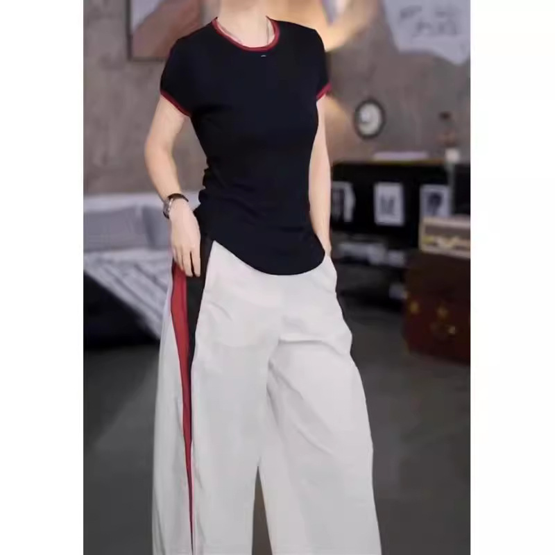 24309 Big Aimei Yiyuan 2024 Summer New Round Neck Color-matching Slim-fit T-shirt Casual Loose Leg Pants Women's Trendy