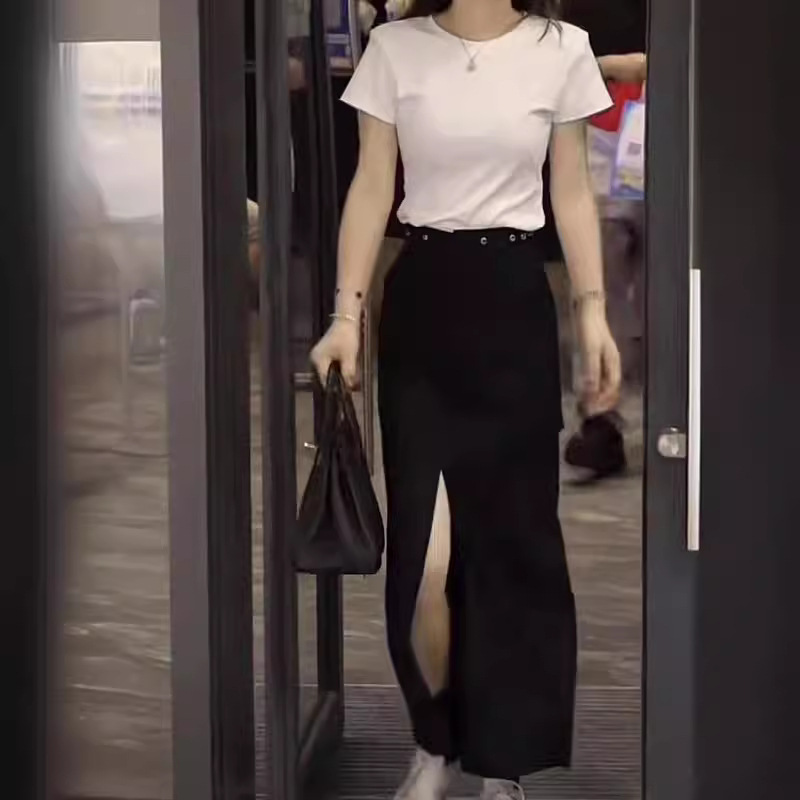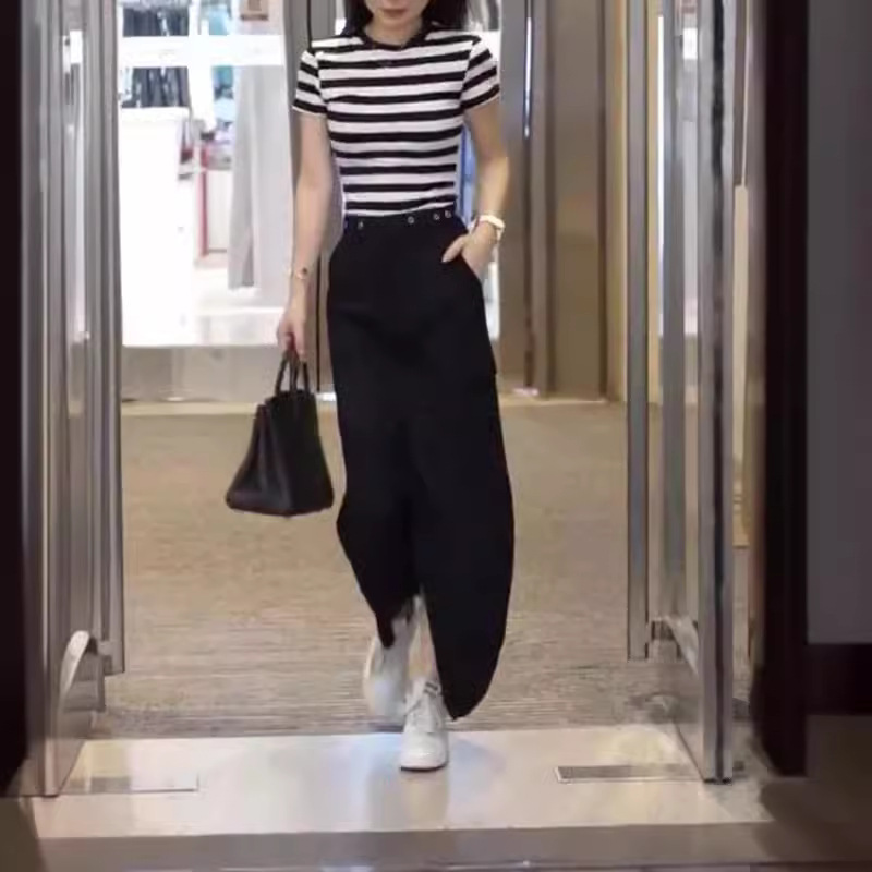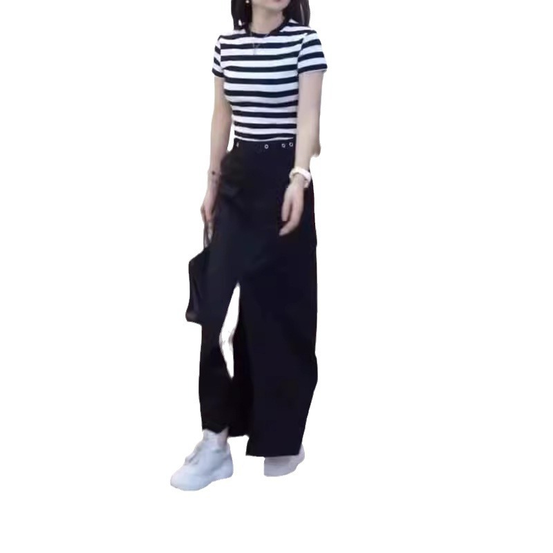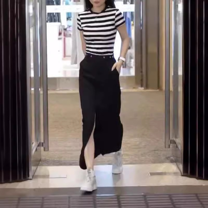 | nameOriginal | 24337 Big Aimei Yiyuan 2024 Summer New Round Neck Striped Base Shirt High Waist Split Skirt Slimming |