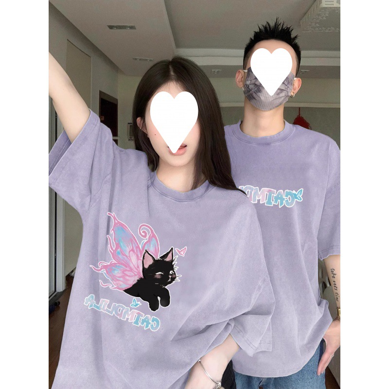 [250g double yarn -220g combed] cotton butterfly cat couple summer fashion brand very fairy short sleeve T-shirt