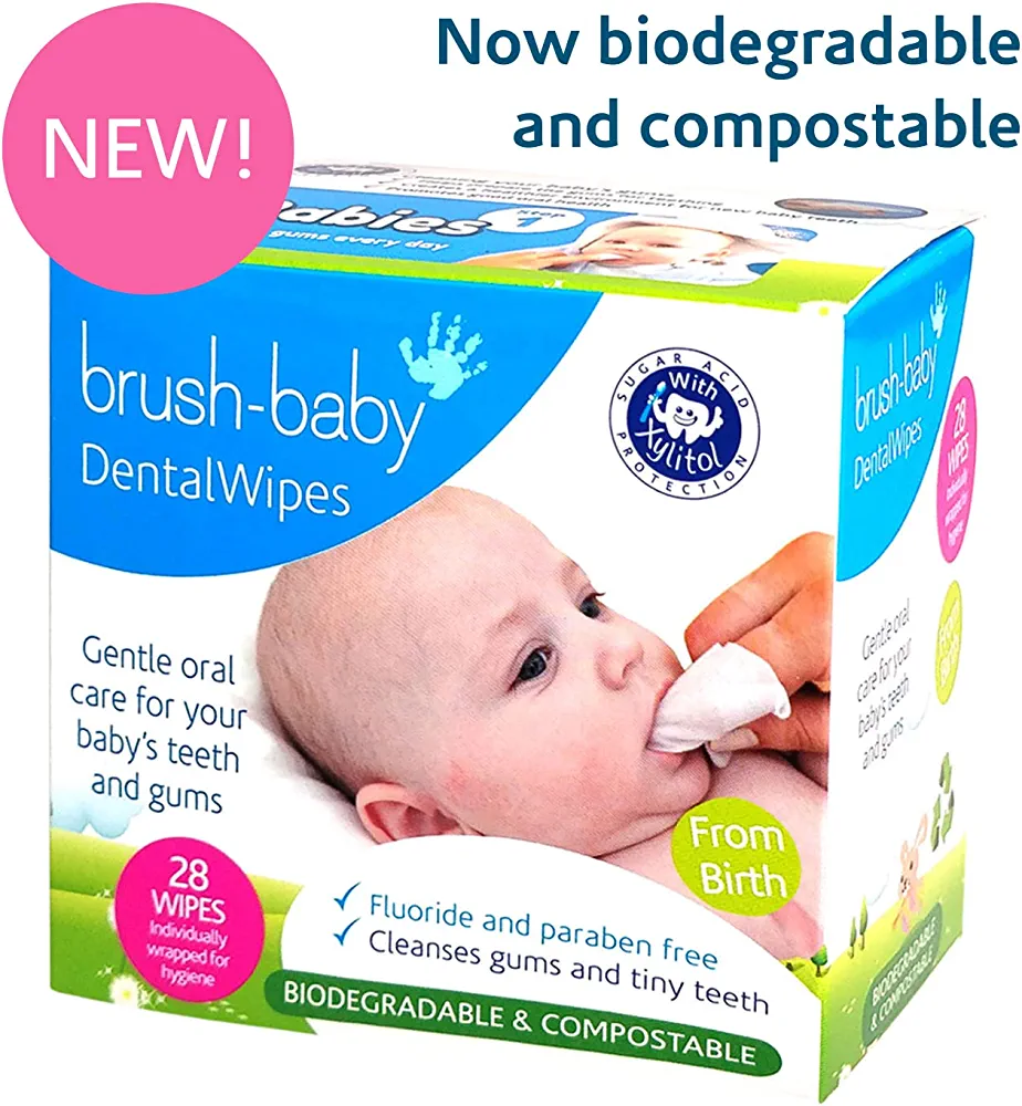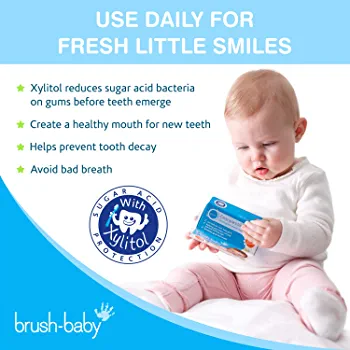 | descriptionOriginal | Brush-Baby Teething Wipes for Babies Having a sister who is a dentist I was well aware how important it was to keep my baby girl's gums and teeth clean. I was careful about what she ate and wanted to teach her that good oral hygiene habits (including liking her dentist!) could be fun, healthy and cool. But tooth-brushing time could be a real battle! She would chew her toothbrush, if I could get it into her mouth at all. When I went to the shops there was little available to help me. And so Brush Baby was founded! Your little one's journey from baby teeth to adult teeth is as individual as they are, so our products have been developed with their individual stage in mind. We know what it takes to give your babies, toddlers, and young children the best start with their oral health and encourage them to develop healthy brushing habits. Brush-Baby Teething Wipes are the perfect gum and tongue cleaner and an ideal alternative to a toothbrush in the early days before baby teeth start to emerge. Our natural plant-based Xylitol solution reduces teething pain and discomfort by neutralizing sugar bacteria on the gums before teeth emerge. Cleans Gums & Teeth Wipe around the surface of the gums, teeth, tongue and cheeks for a residue free healthy oral environment that will help prevent emerging tooth decay and bottle breath. Sized Just Right For ages 0-Toddler, our individually wrapped wipes were designed to fit around a man’s finger but also slim enough to fit in a baby’s mouth without sacrificing durability. Chemical Free Each individual packaged wipe is medically sealed to avoid dried out wipes and bacterial contamination in our Fluoride and Paraben free Xylitol solution. |