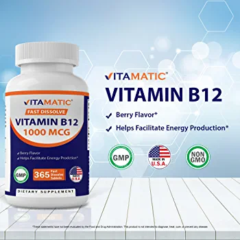 | nameOriginal | Vitamatic Vitamin B12 1000 mcg Fast Dissolve 365 Tablets – Berry Flavor – Supports Energy Metabolism (3 Bottles) |