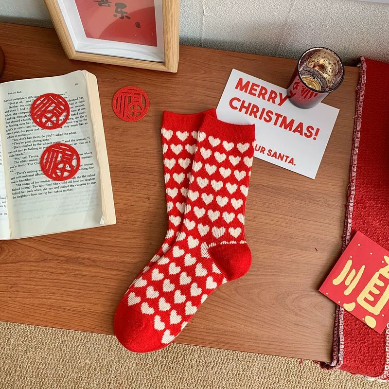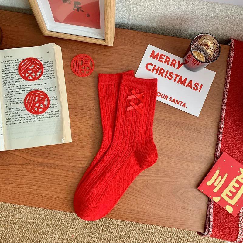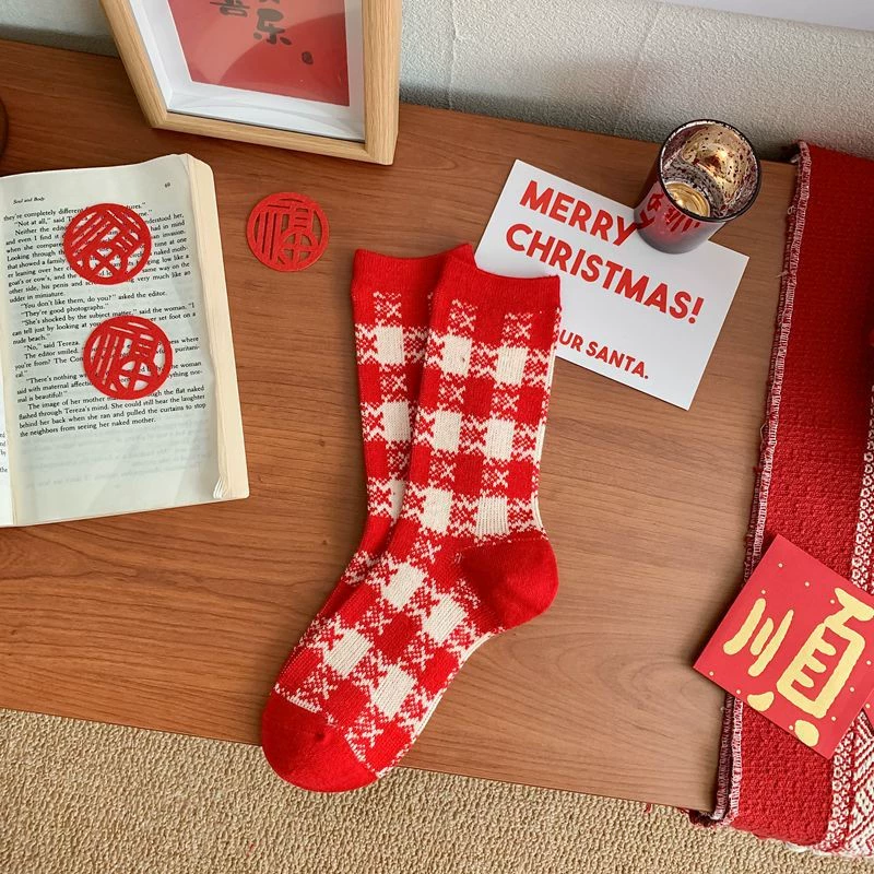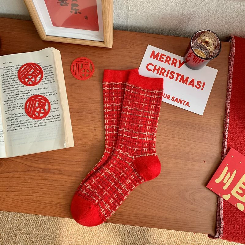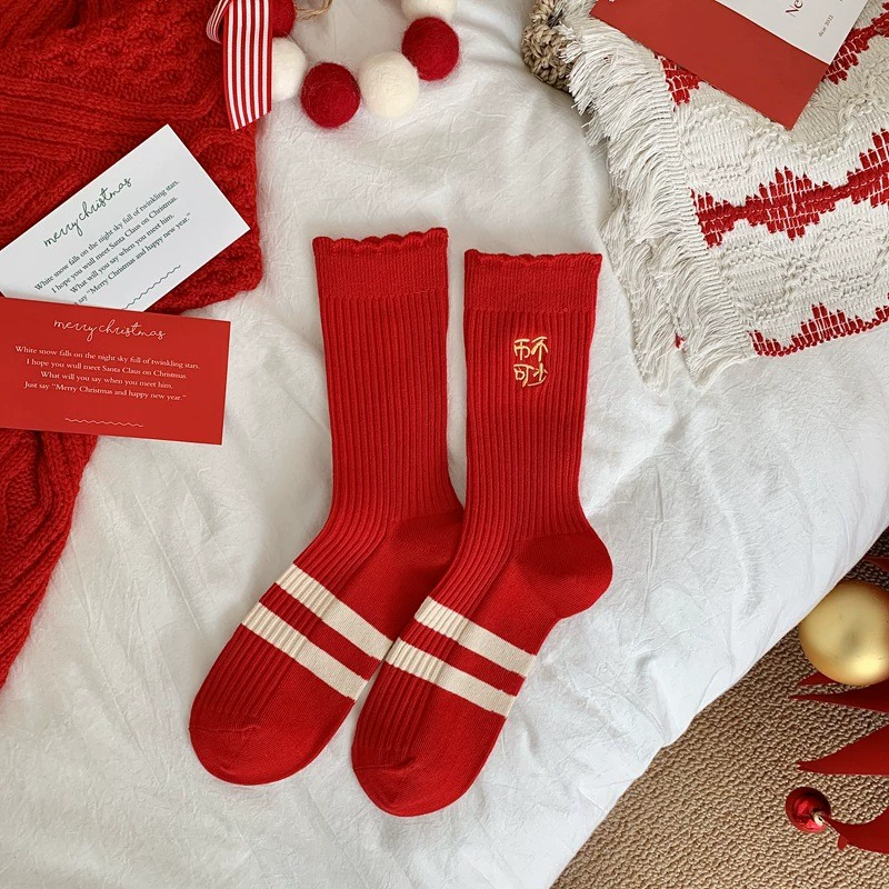 3 pairs of free shipping New Year’s red socks for women’s wedding year, autumn and winter warm mid-calf socks, combed cotton wool stockings