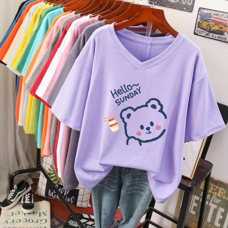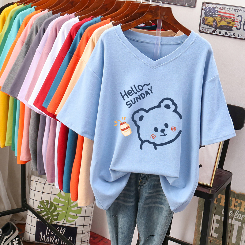 300 Jin chubby girl Short-sleeved T-shirt Women’s plus size Loose Slim Design Sense Niche Belly Covering Cotton V-neck Clothes