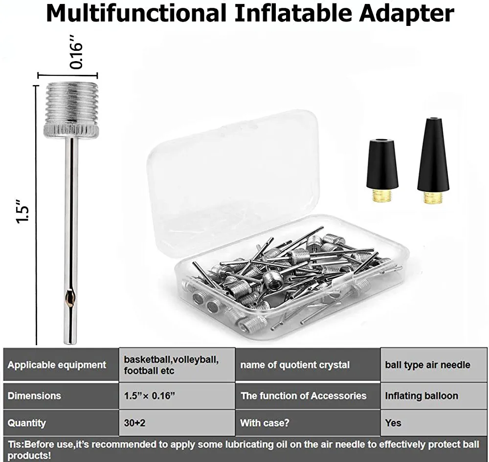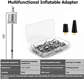 This product boasts an effective design with a rounded hollow and dual-port adapter tip that increases airflow and speeds up inflation while preventing punctures to balls. It is made of high-quality stainless steel that is strong, safe, and portable, making it an excellent choice for sports enthusiasts, coaches, and teachers. The pack includes 30 standard-shaped ball inflate needles measuring about 1.5 inches in length and 0.27 inches in outside diameter, as well as 2 ballon inflation needles for birthday party balloons, swing rings, and other inflatables. These needles are compatible with various pumps, including air pumps, hand pumps, ball pumps, and bike pumps, and can be used for a wide range of inflatable sport balls such as football, soccer, yoga balls, handball, basketball, volleyball, rugby, netballs, and more. The product also comes with a portable storage box for easy storage and transportation.