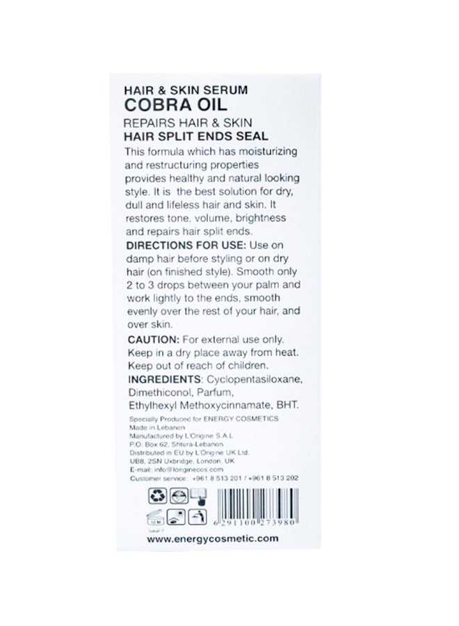 Introducing the Cobra Hair and Skin Repair Oil, a powerful and natural solution for all your hair and skin concerns. This 30ml bottle is packed with nourishing ingredients that work together to repair and rejuvenate damaged hair and skin.