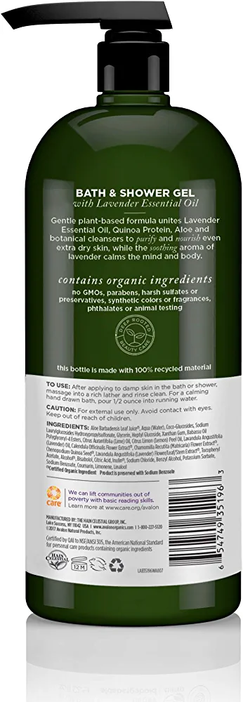 | descriptionOriginal | Description Gently cleanse and hydrate extra dry skin with Avalon Organics Nourishing Lavender Bath & Shower Gel. Made with organic botanicals and essential oils, this plant-based formula deeply nourishes and moisturizes skin while washing away impurities. Lavender essential oil, quinoa protein and aloe work together to replenish skin, leaving it feeling soft and supple. This EWG VERIFIED body wash is made with non-GMO ingredients and no parabens, harsh preservatives, synthetic colors or fragrances, phthalates or sulfates. It is also vegan and not tested on animals. Includes one 32 oz. bottle of Avalon Organics Nourishing Lavender Bath & Shower Gel. Curated from nature’s pure resources, Avalon Organics NSF organic certified skin care, hair care and bath & body products are deep-rooted in a profound respect for the earth. Combining modern science with the botanical world, we constantly strive to perfect each formula, evolve expertise and deliver innovation. Searching out the beautifying benefits hidden within each plant, Avalon Organics thoughtfully develops formulas to not only nourish the body, but also nourish the mind and the soul. |