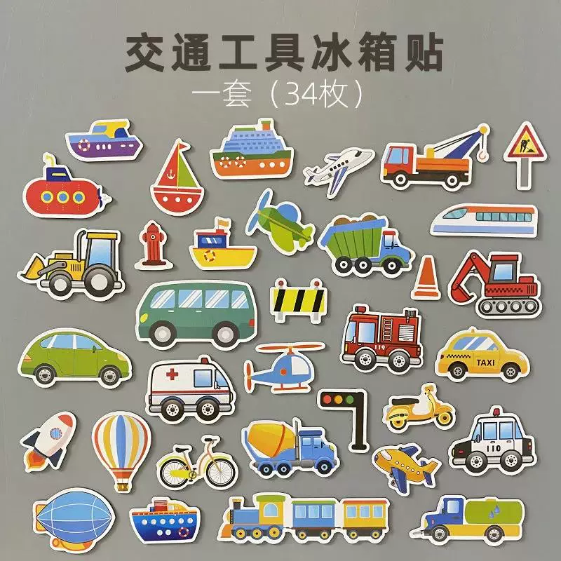 | nameOriginal | 34 cartoon vehicles, refrigerator stickers, ships, excavators, automobiles, engineering fire trucks, airplanes, bicycles, magnetic stickers |