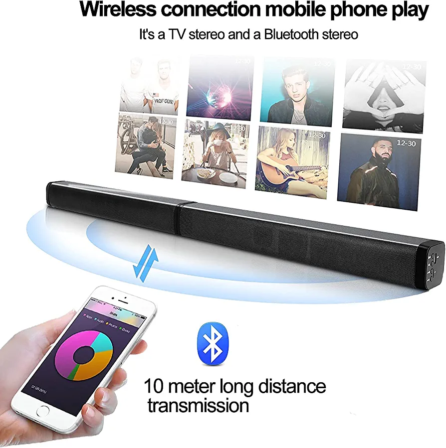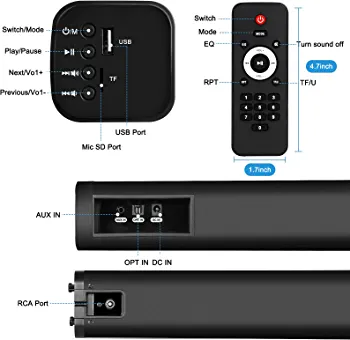 The included remote control is simple, compact, and easy to use. You can comfortably control your sound bar from the sofa, switching songs and modes, and adjusting the volume.