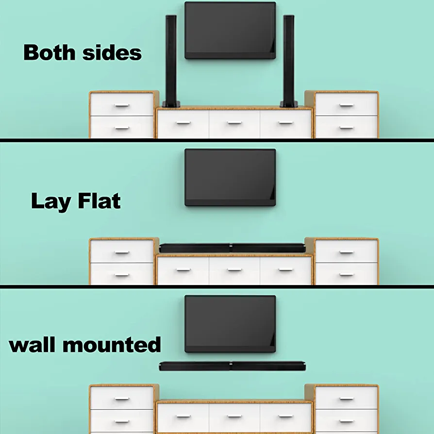This sound bar is a versatile addition to your home entertainment system. It features two 18.5 inch speakers that are easy to install and ready to use right out of the box. You can place it flat under your TV cabinet or connect it to the base and stand it on both sides of your TV.