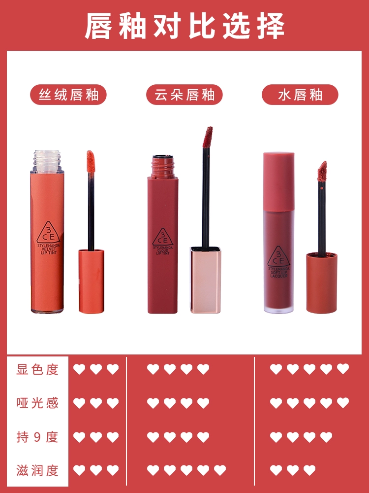| nameOriginal | 3ce water mist lip glaze pipe lipstick women's lip mousse cloud water light velvet mirror taupe red pear color new style |