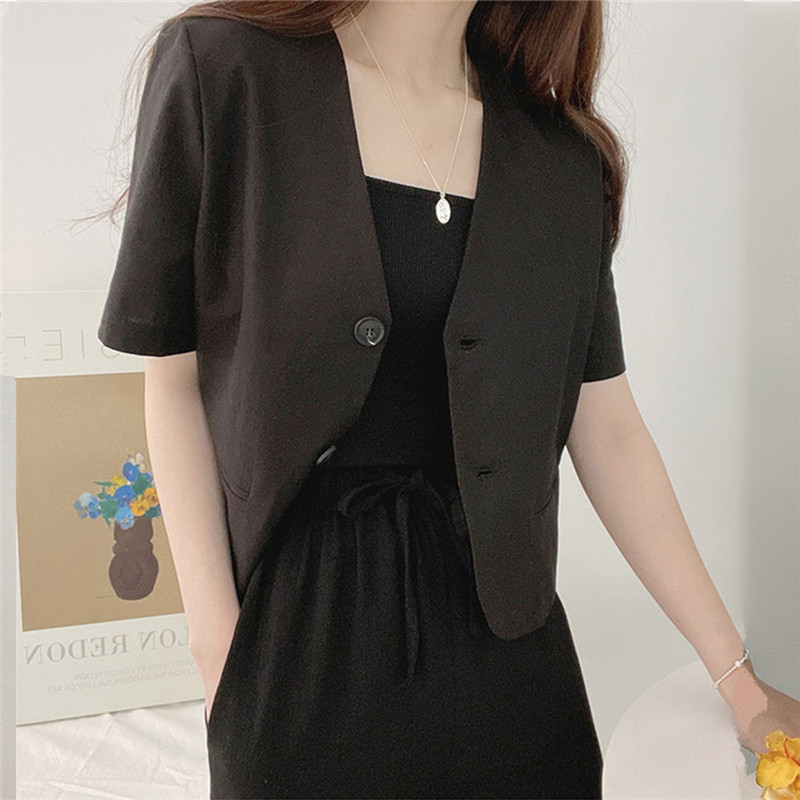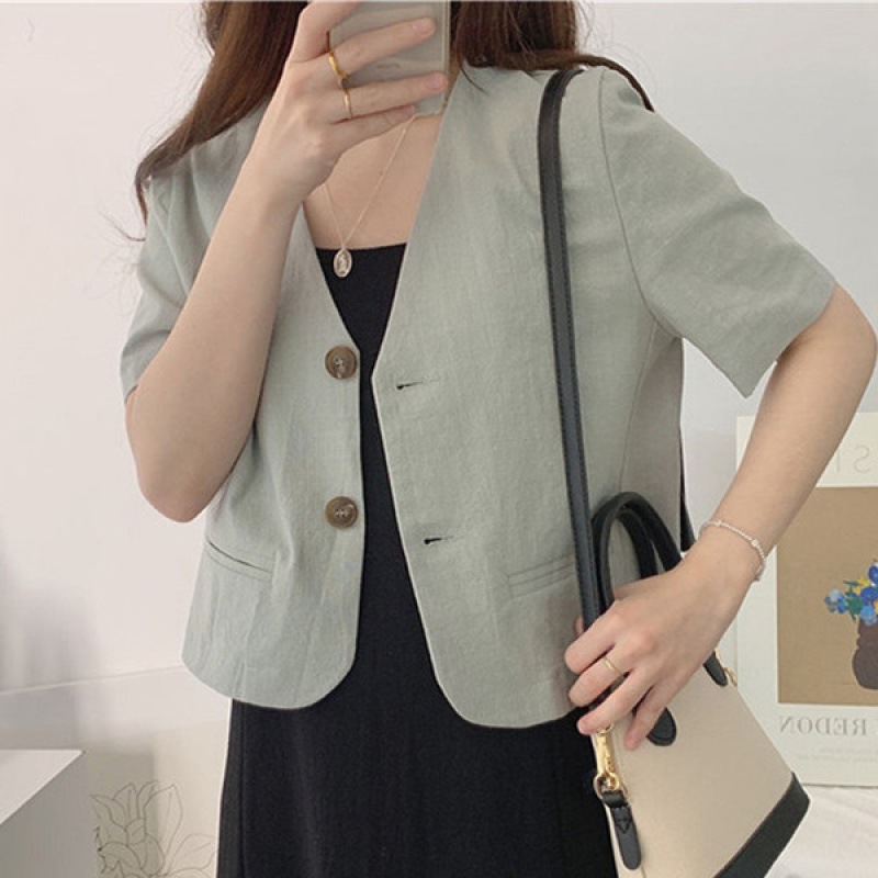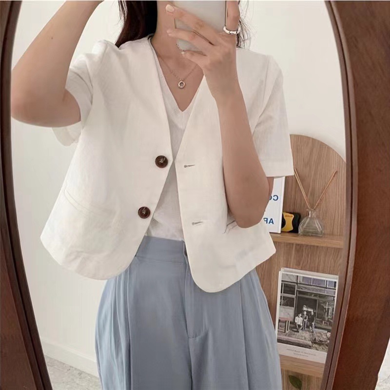 | nameOriginal | 4 Color Fresh Style Deep V-neck Cotton Linen Casual Air Conditioning Jacket Women's 2023 Korean Style Simple Two-button Short-sleeved Suit |
