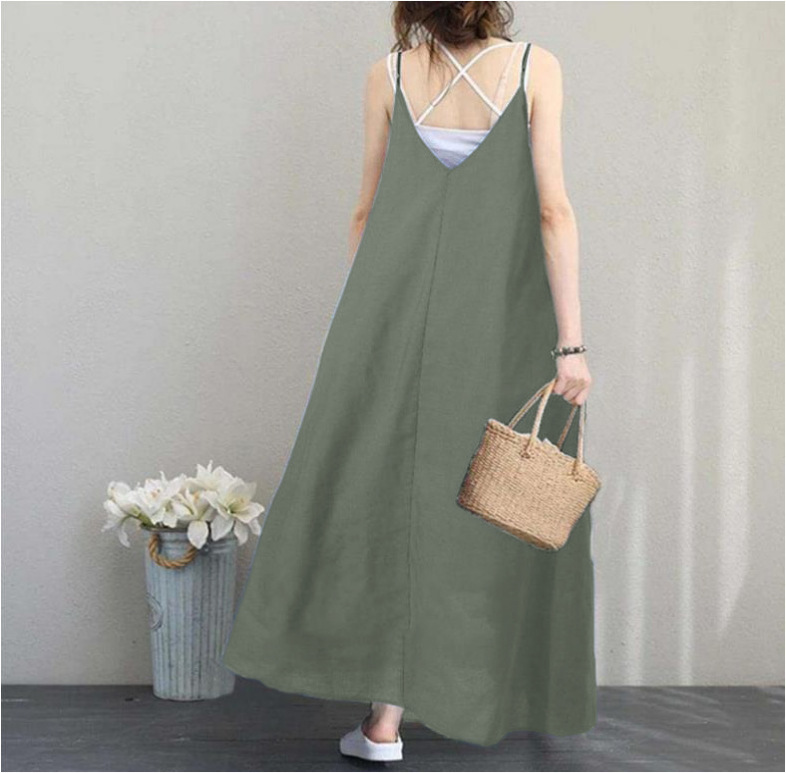 | nameOriginal | 4 Color Women Casual Loose Solid Dress V-neck Backless Sexy Long Dress Sleeveless Women Party Gown |