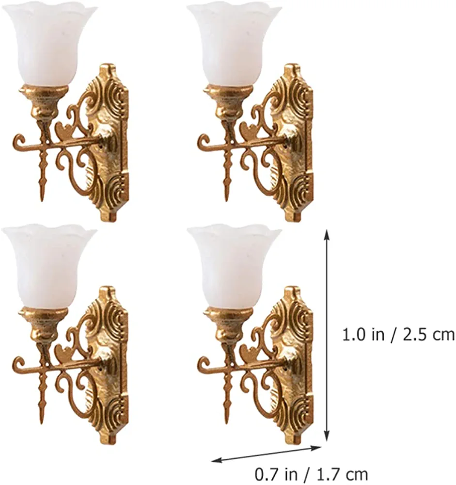 4 Golden Miniature Wall Lamps for Dollhouse, Outdoor Lantern Style.