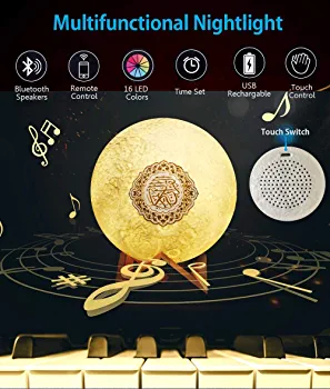Portable Bluetooth Speaker, 4 in 1 Quran Speaker with 16 Colors 3D Print Moon Lamp Night Light, Quran Recitations and Song FM Broadcast