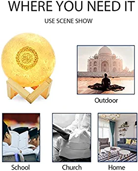 PACKAGE INCLUDES: 1 x Quran Speaker Lamp 1 x USB cable 1 x Remote 1 x User Manual 1 x Gift box