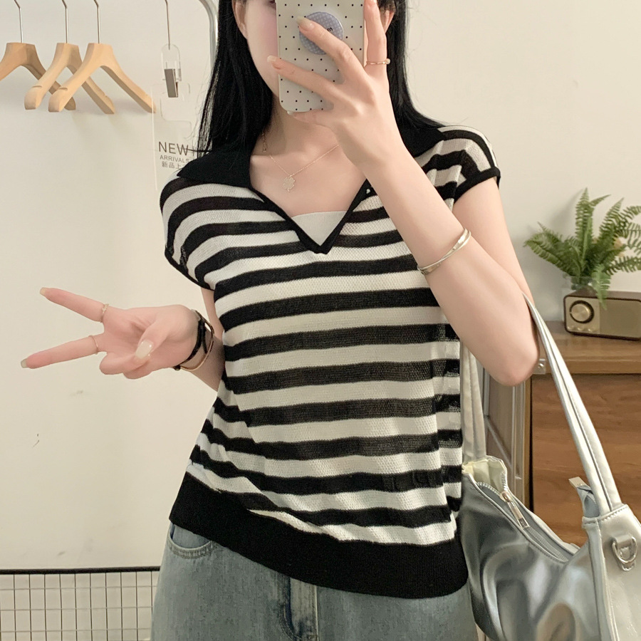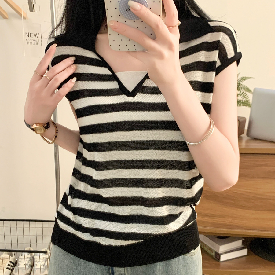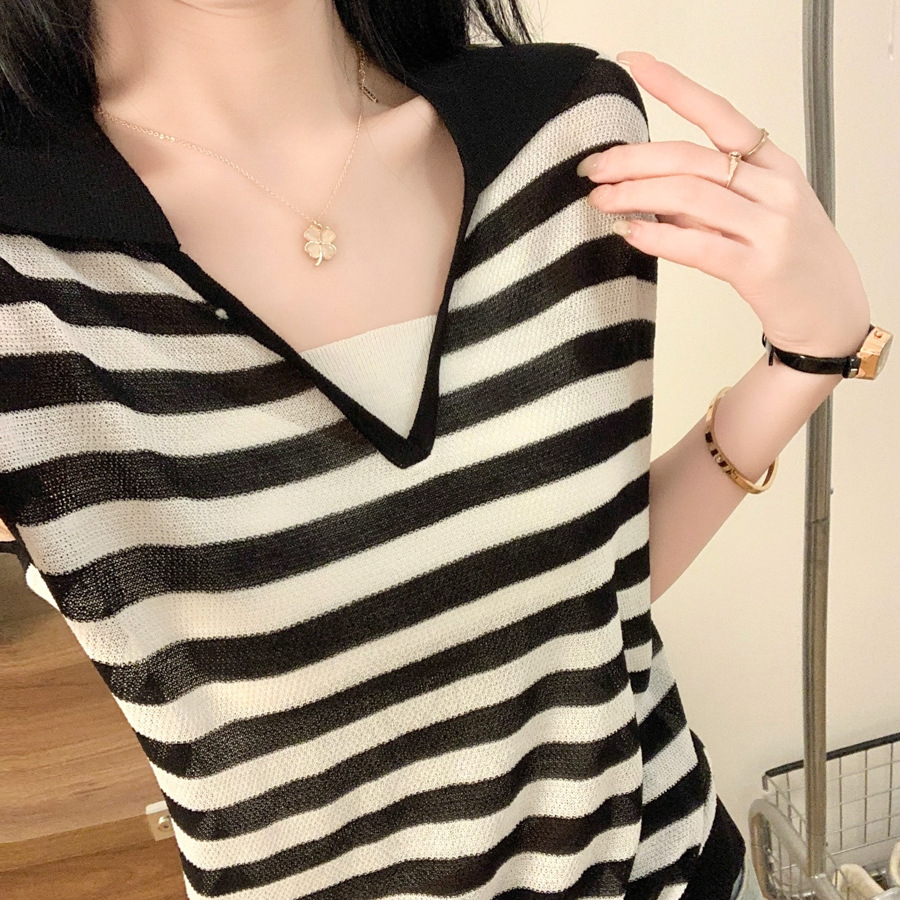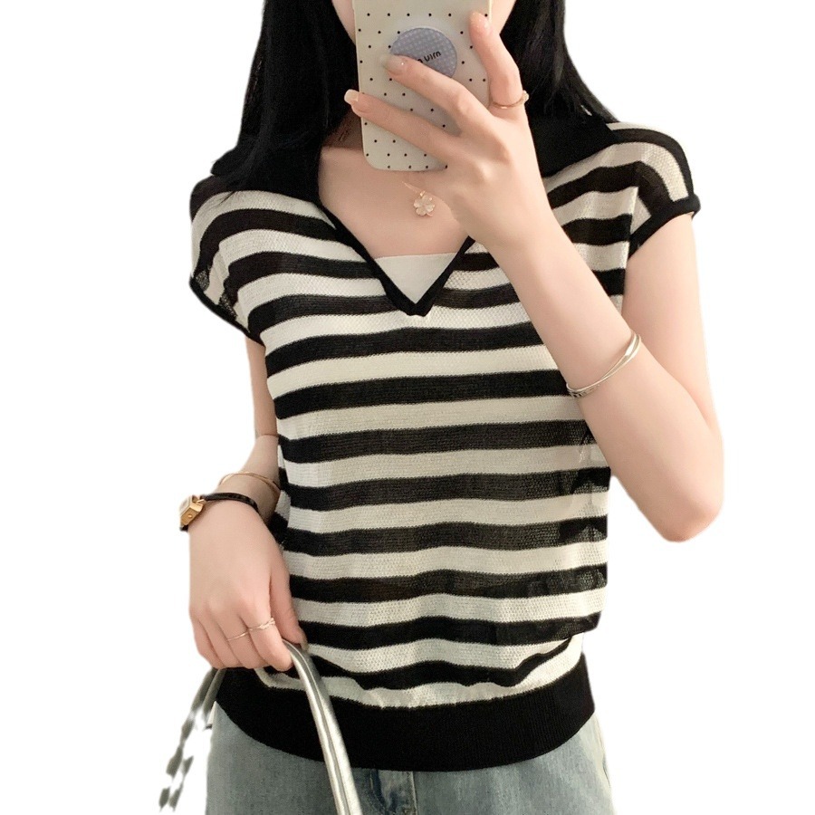 40.00 kg-70.00 kg! 2024 Summer V-neck Korean Style Vest Knitted Chinese Fir Thin Striped Ice Silk T-shirt