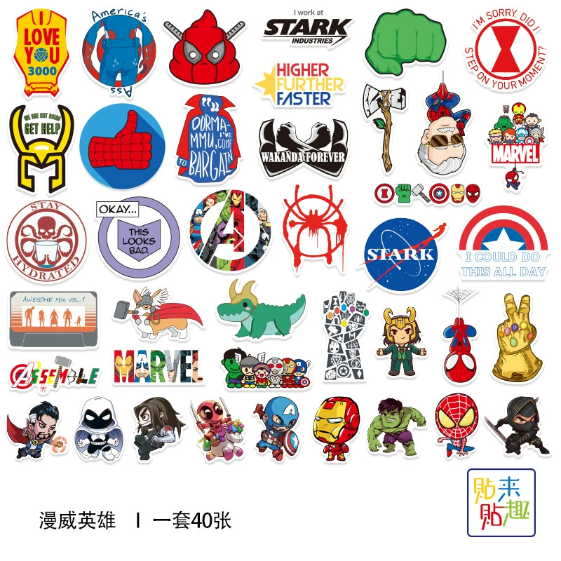 | nameOriginal | 40 Marvel hero logo cartoon stickers, personalized laptops, mobile phones, tablets, water cups, helmet stickers, waterproof |