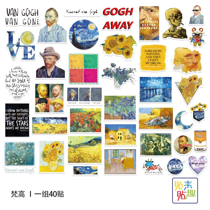 | nameOriginal | 40 pieces of European and American retro literary Van Gogh oil painting stickers, personalized luggage, computer case, skateboard guitar decorative stickers |