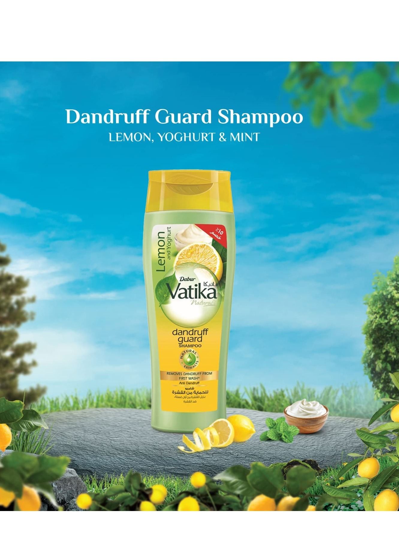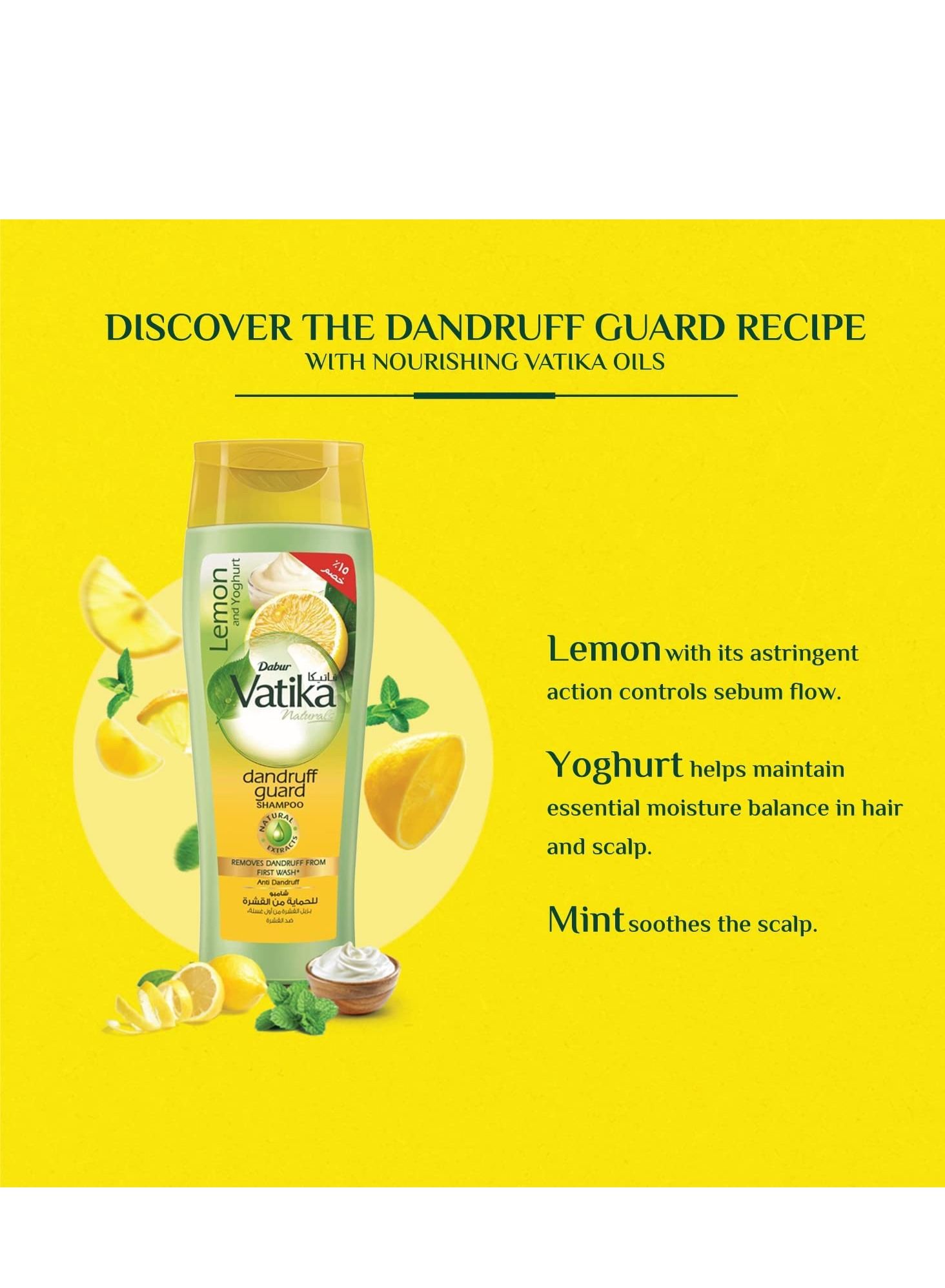 This shampoo contains lemon, which helps control sebum flow and prevent dandruff, while yoghurt maintains essential moisture balance in the hair and scalp. Mint is also included to soothe the scalp. With its thick lather, this shampoo effectively gets rid of dandruff, leaving your scalp flake-free and your hair manageable and shiny. It also helps fight against itchiness caused by dandruff. To use, simply massage gently into wet hair and scalp, spread evenly, lather, and rinse thoroughly. This 400 ml bottle of Vatika Naturals Dandruff Guard Shampoo is perfect for those looking for a solution to their dandruff problems.