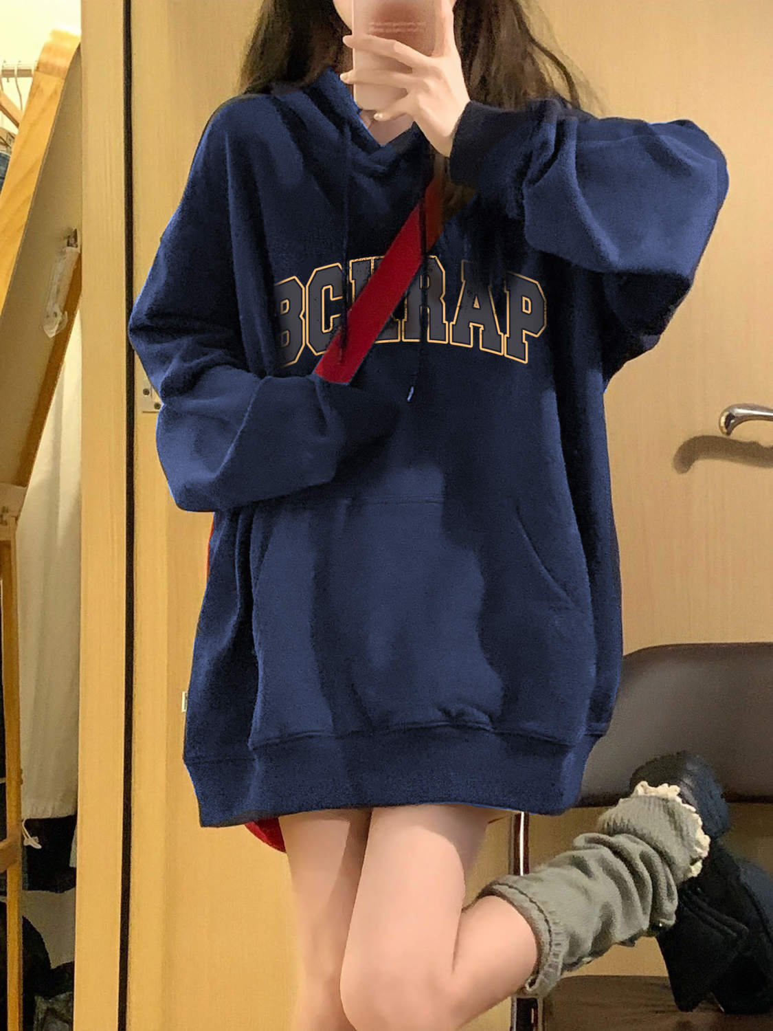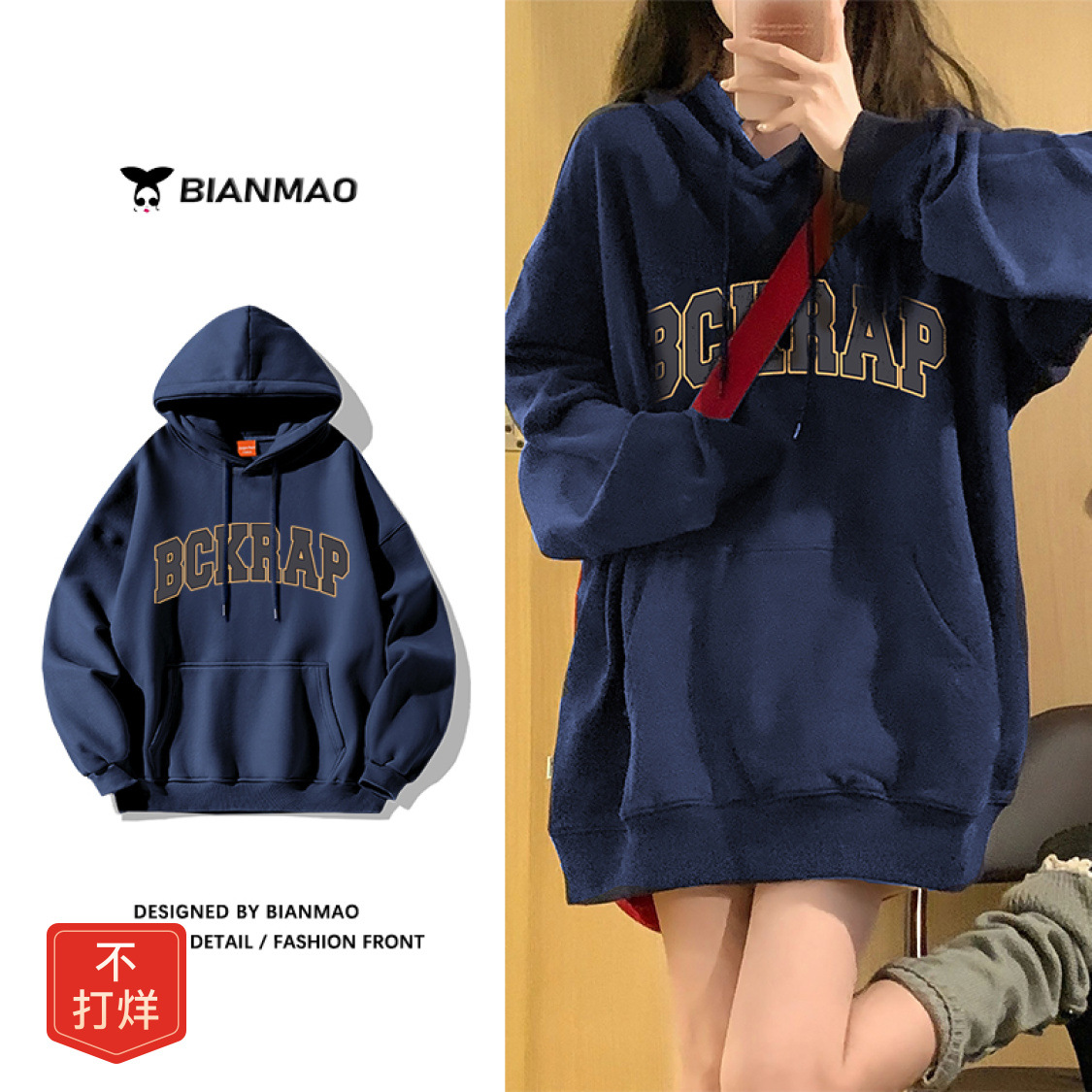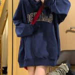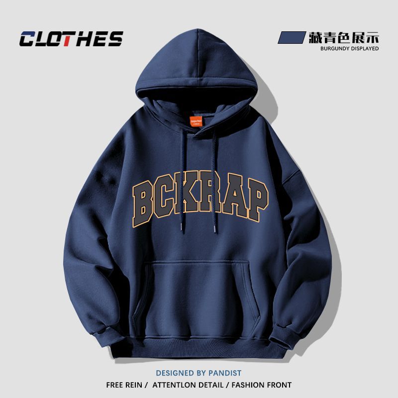 [48-hour delivery] navy blue American hiphop hooded sweater women’s autumn and winter fleece-lined thickened oversi