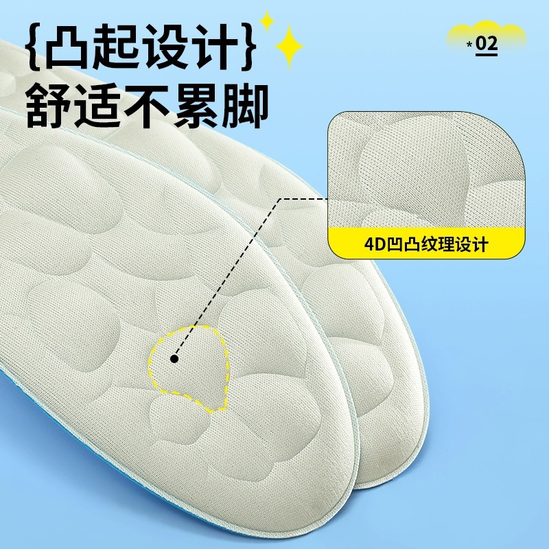 4D Insole Thickened Feeling Comfortable Soft Sole Men's and Women's Insoles Deodorant Sweat Absorbing High Elastic Shock Absorbing Sports Insole Leather Shoes